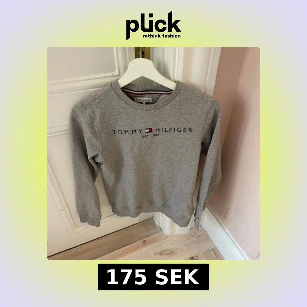 Säljer en stilren grå sweatshirt från Tommy Hilfiger med broderad logga och text på bröstet. Tröjan har rund halsringning och långa ärmar. Perfekt för en avslappnad och snygg look.