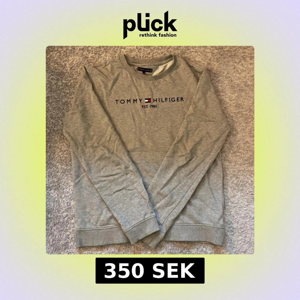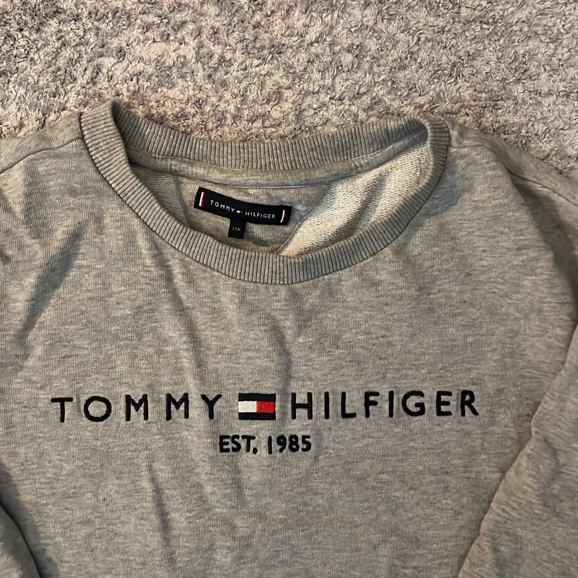 Säljer en stilren grå sweatshirt från Tommy Hilfiger med broderad logga och text på bröstet. Tröjan har rund halsringning, långa ärmar och ribbade muddar. Perfekt för en avslappnad och snygg look.