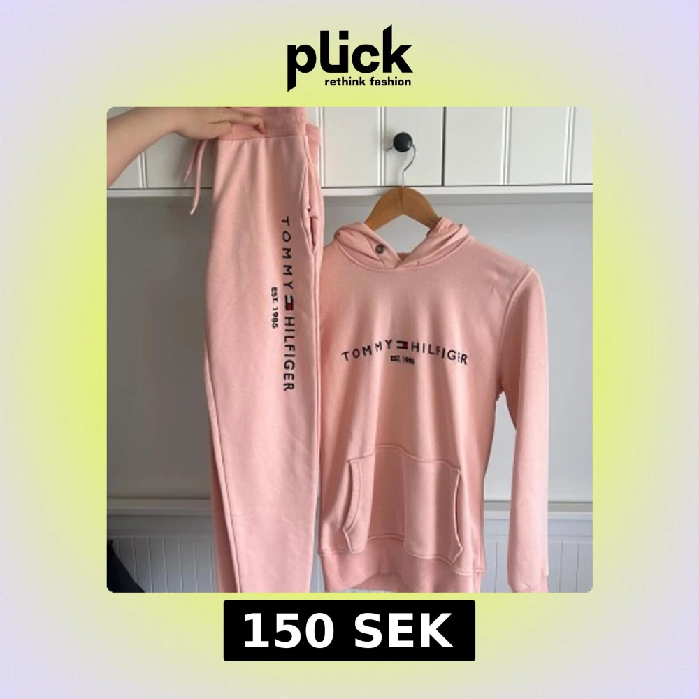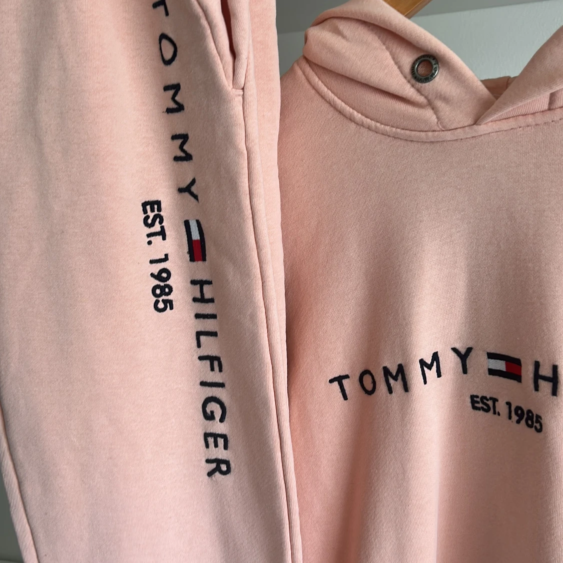 Säljer en ljusrosa hoodie från Tommy Hilfiger med svart logotyp och text 'EST. 1985' på bröstet. Tröjan har huva med dragsko och en stor magficka. Perfekt för en avslappnad stil. Hela setet för 150