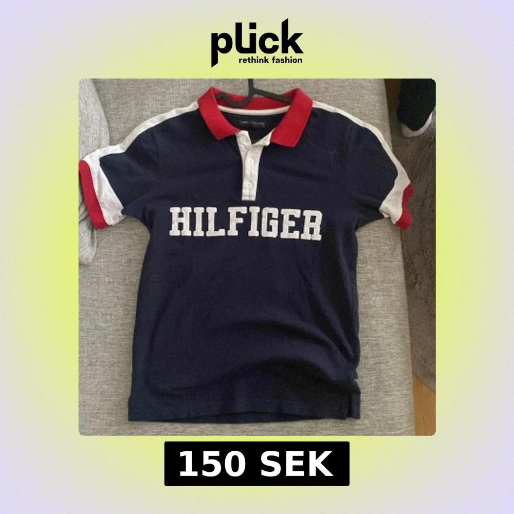 Snygg blå pikétröja från Tommy Hilfiger med röd krage och vita detaljer. Stort 'HILFIGER' tryck på framsidan. Perfekt för en casual look. Stl S. Frakt tillkommer.
