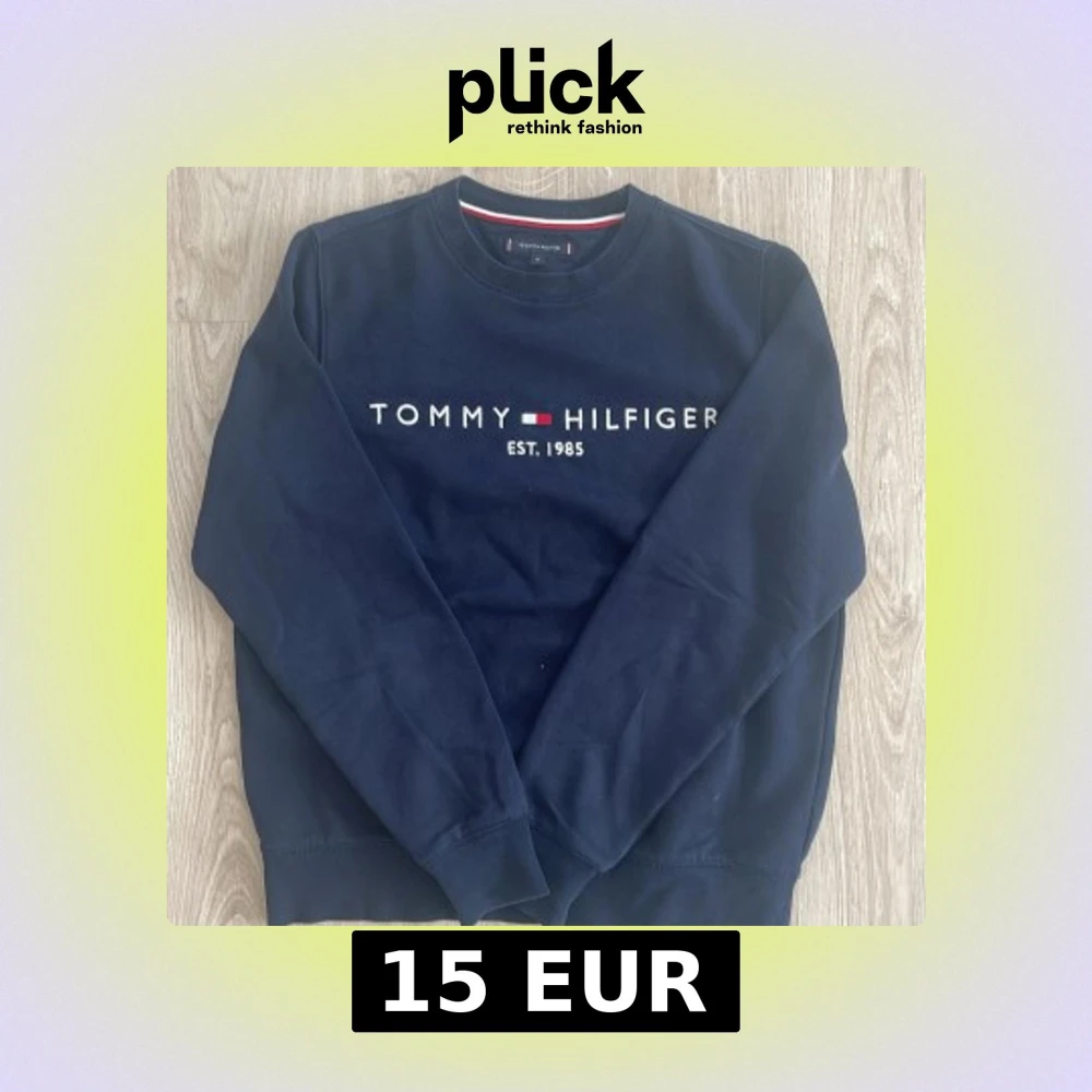 Säljer en mörkblå sweatshirt från Tommy Hilfiger med klassisk logga och texten 'EST. 1985' broderad på bröstet. Tröjan har rund halsringning och långa ärmar. Perfekt för en stilren och avslappnad look.