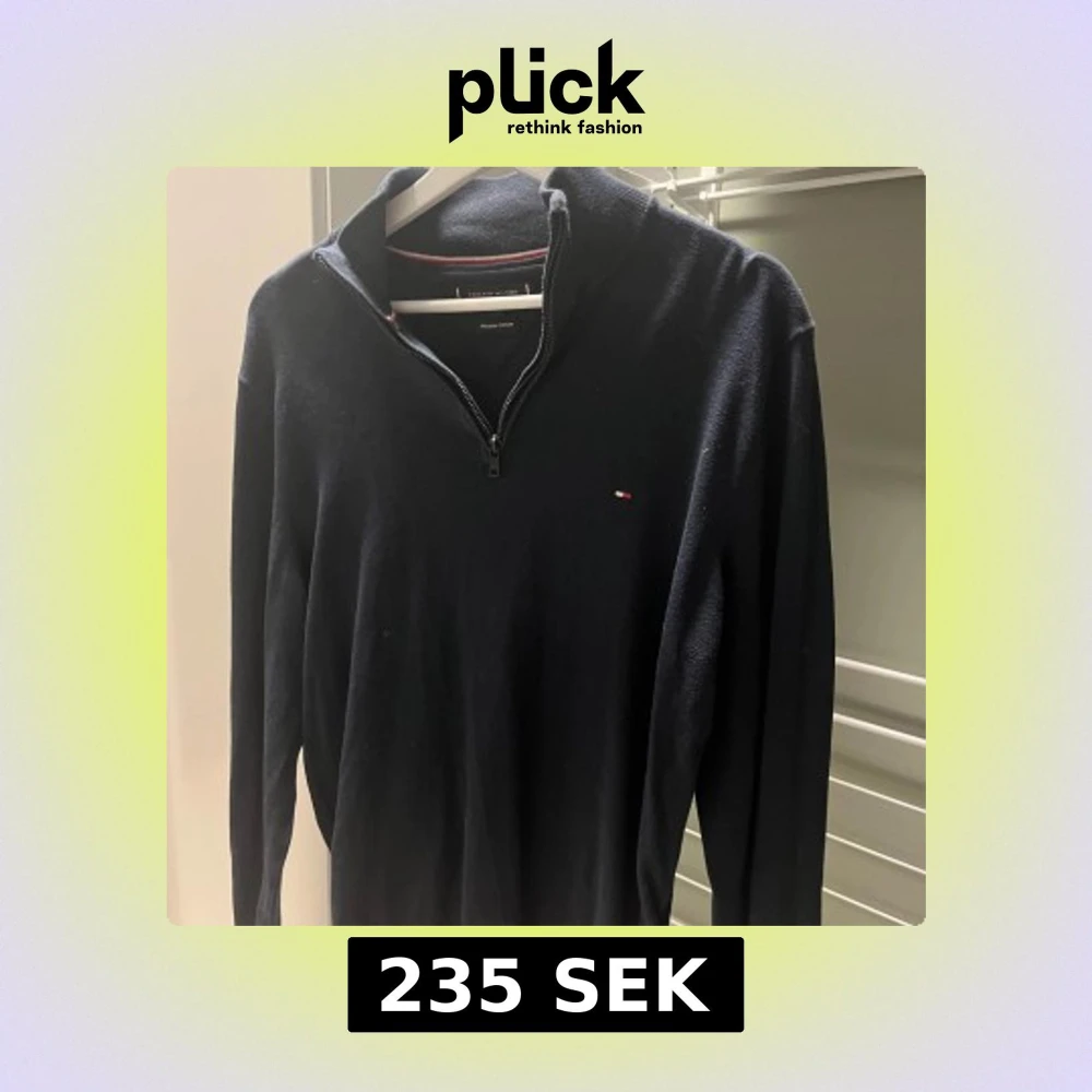 Säljer en stilren mörkblå tröja från Tommy Hilfiger med dragkedja vid halsen. Tröjan har långa ärmar och en liten logotyp på bröstet. Perfekt för en avslappnad och snygg look.