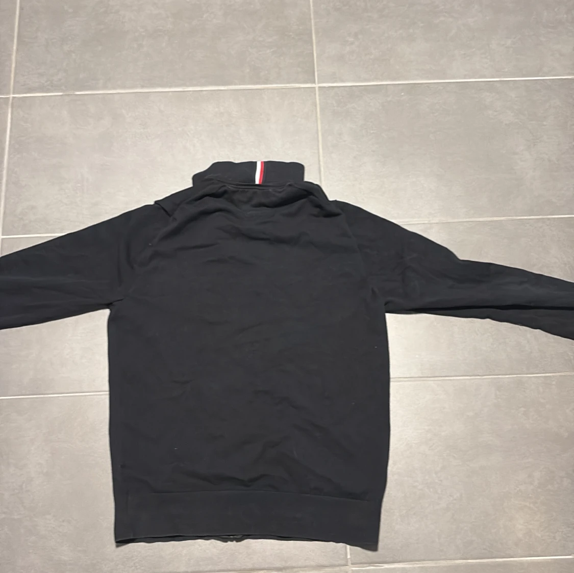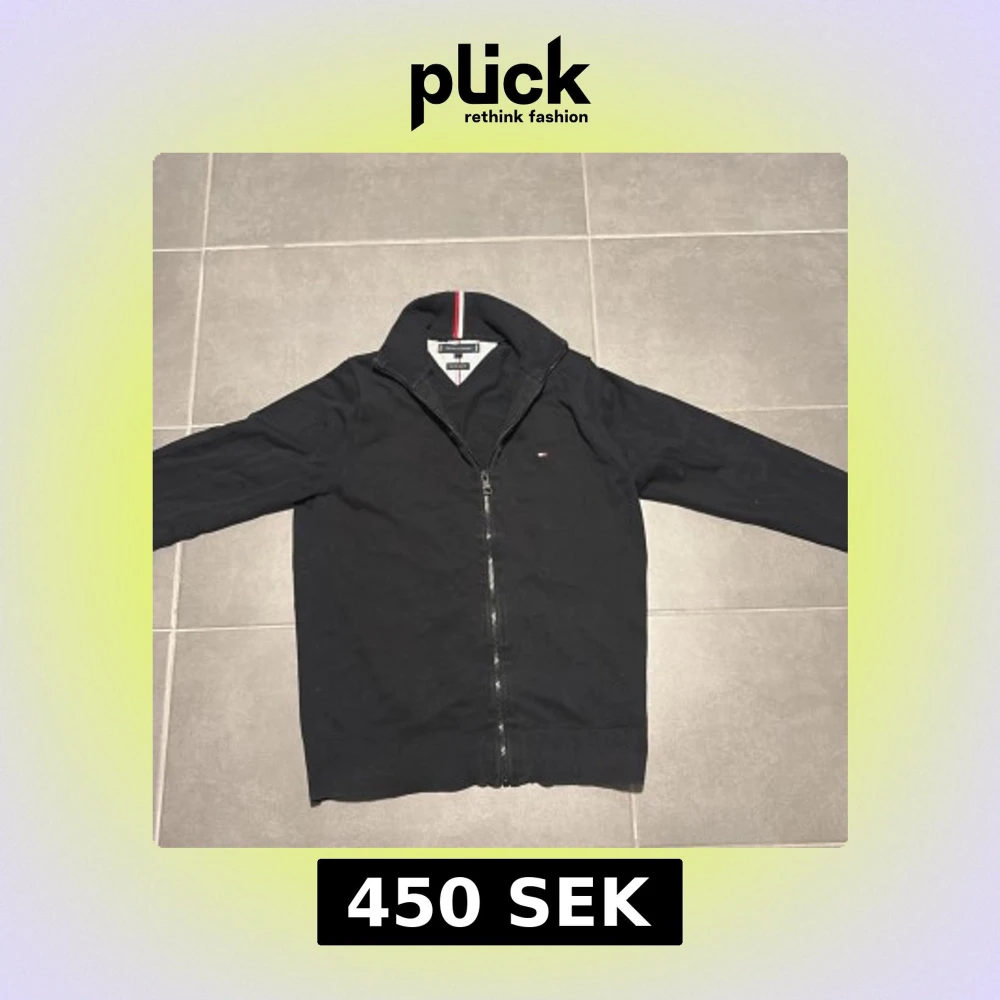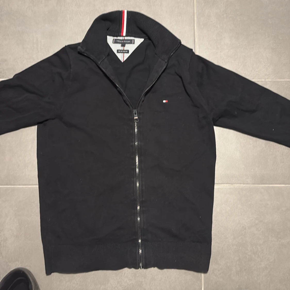 Svart kofta från Tommy Hilfiger med hel dragkedja och långärmad design. Små Hilfiger-loggan på bröstet och snygg krage med röd, vit och blå rand på insidan. Tillverkad i mjuk bomull som är skön att ha på sig. Perfekt för dig som gillar stilrena och klassiska plagg.