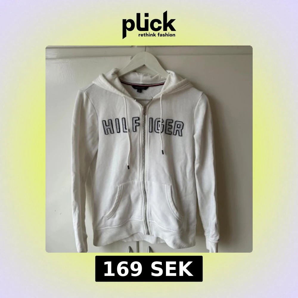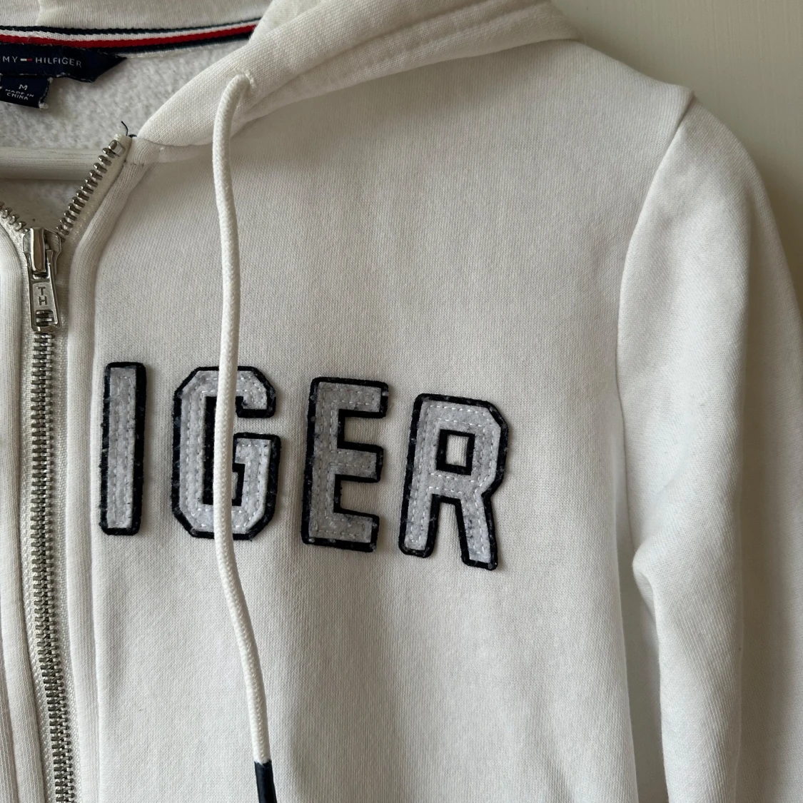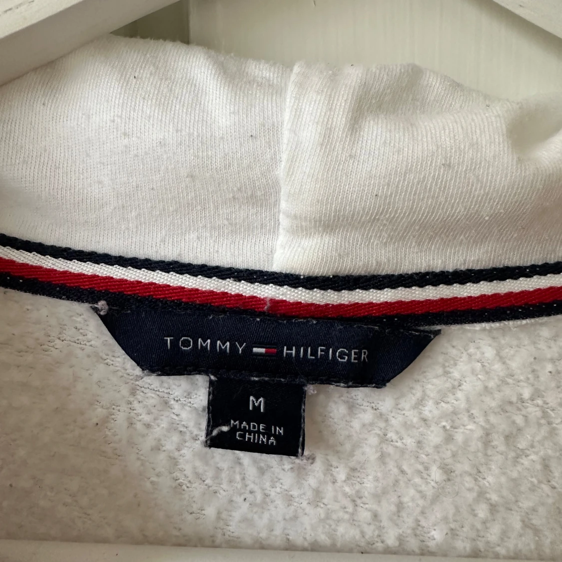 Säljer en stilren vit hoodie från Tommy Hilfiger med dragkedja och huva. Den har märkets namn broderat på framsidan i svart. Perfekt för en avslappnad look.