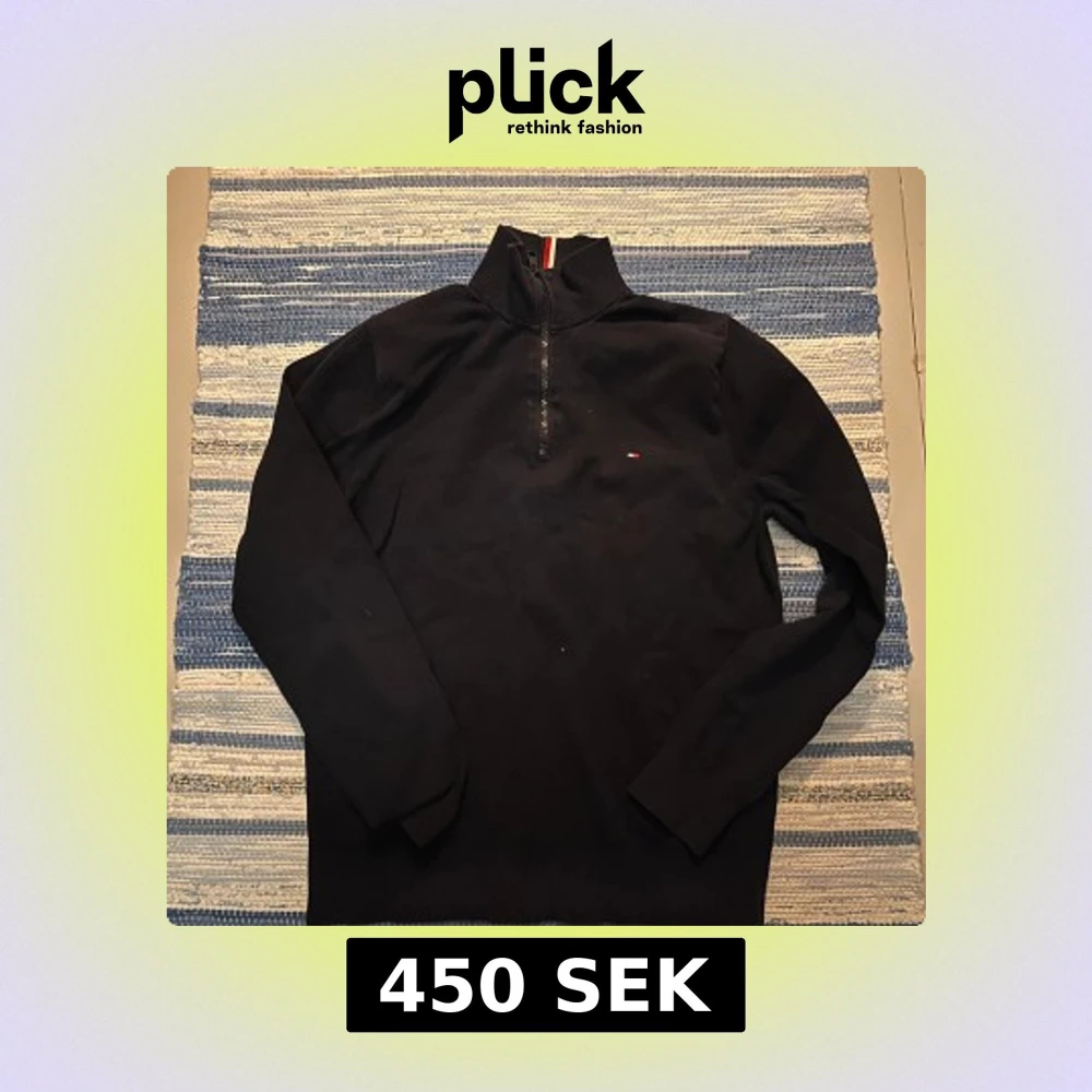 Mörkblå långärmad tröja från Tommy Hilfiger med half zip och liten broderad logga på bröstet. Hög krage med röd och vit rand på insidan. Skön passform och klassisk stil, perfekt till jeans eller chinos.