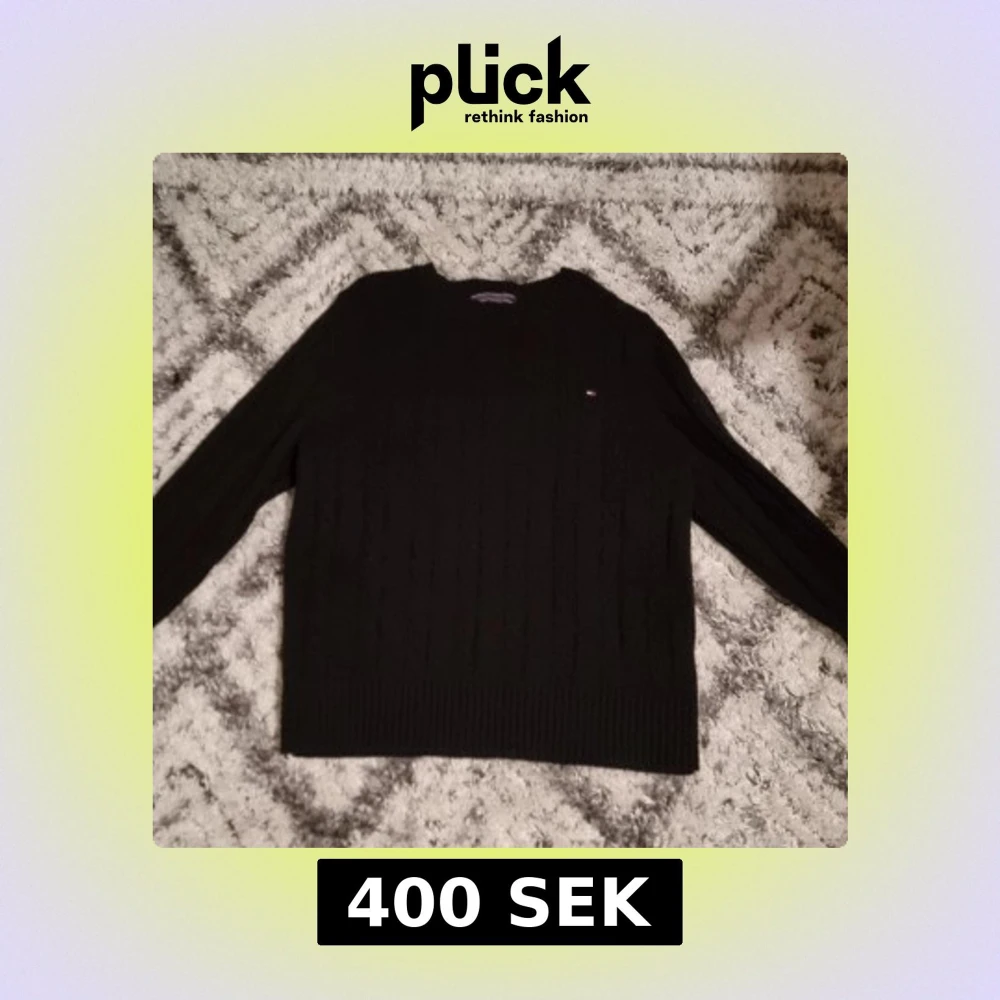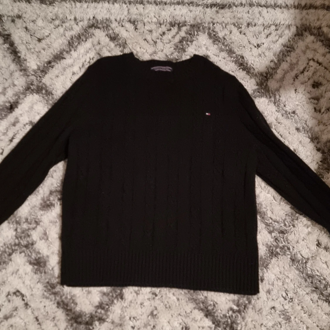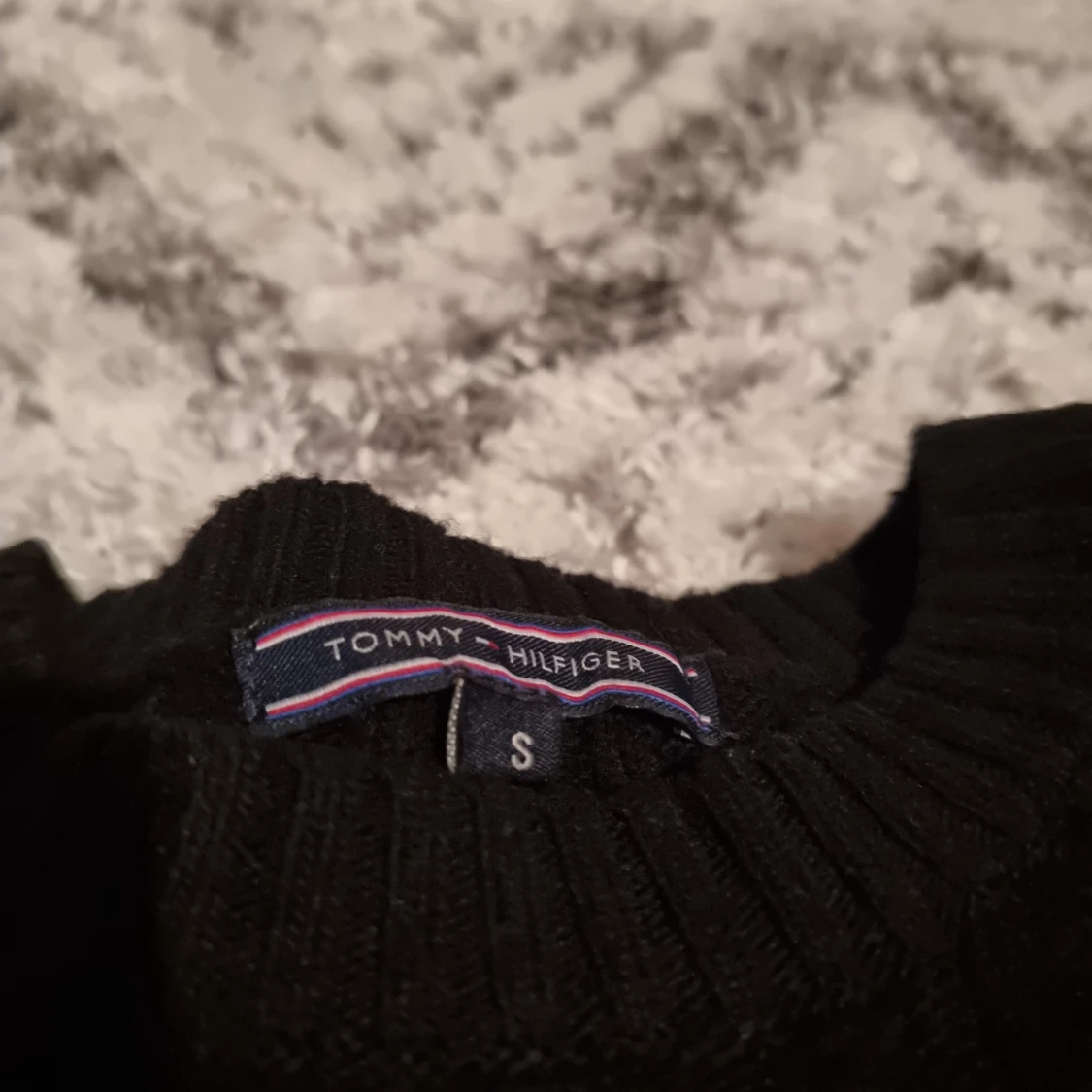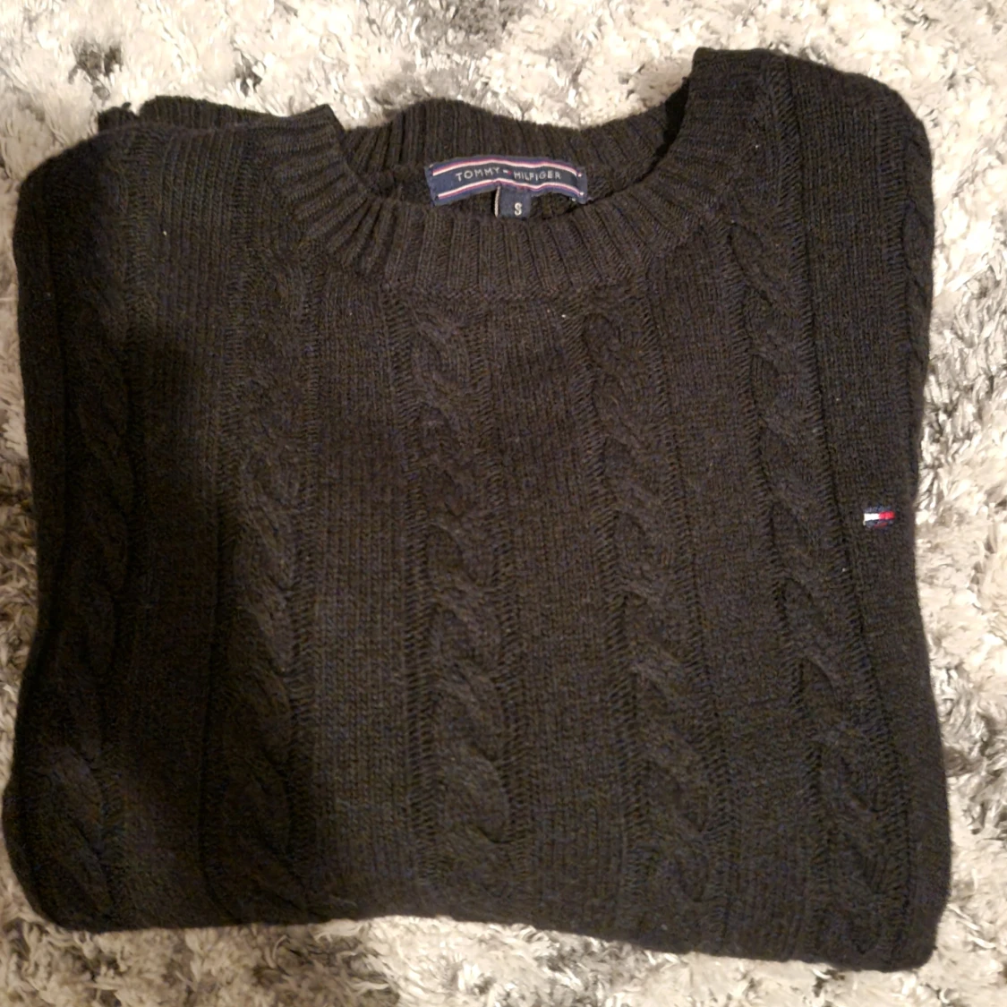 Svart stickad tröja från Tommy Hilfiger i storlek S. Tröjan har kabelstickat mönster, rund hals och långärmade ärmar. Liten Hilfiger-logga broderad på bröstet. Perfekt för dig som gillar klassisk och enkel stil.