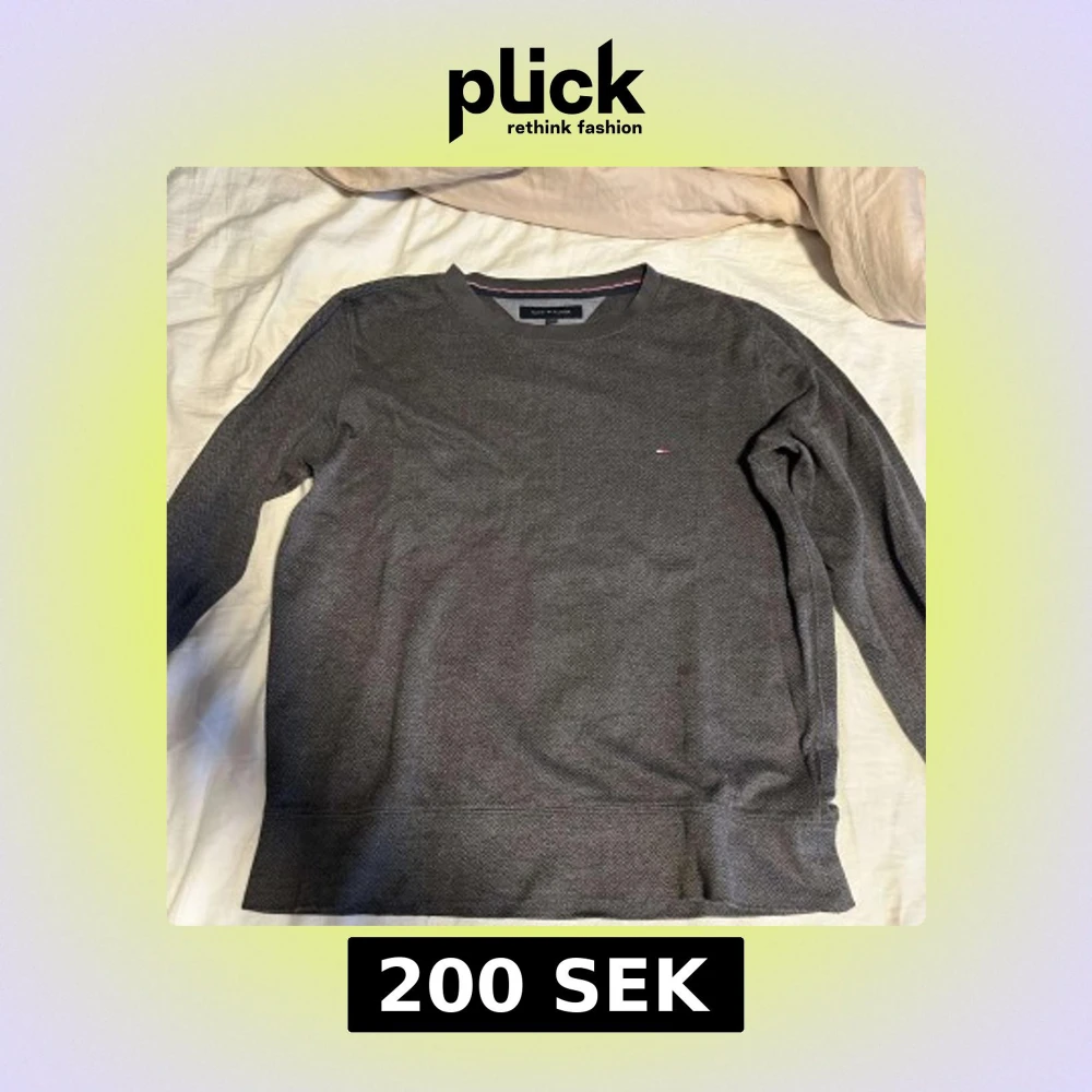 Säljer en stilren grå tröja från Tommy Hilfiger med diskret mönster och rund hals. Tröjan har långa ärmar och en liten logotyp på bröstet. Perfekt för en avslappnad look.