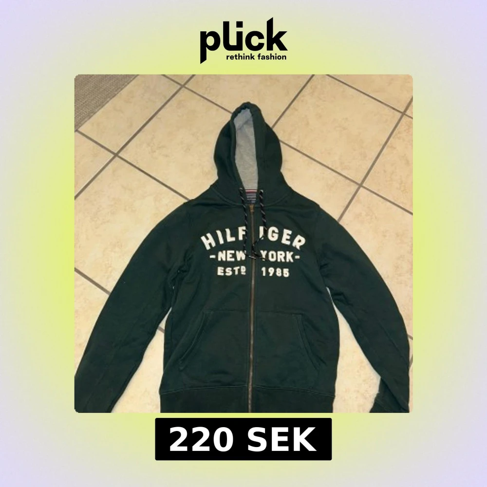Säljer en grön hoodie från Tommy Hilfiger med texten 'Hilfiger New York Estd. 1985' på framsidan. Den har en dragkedja och en klassisk känguruficka.