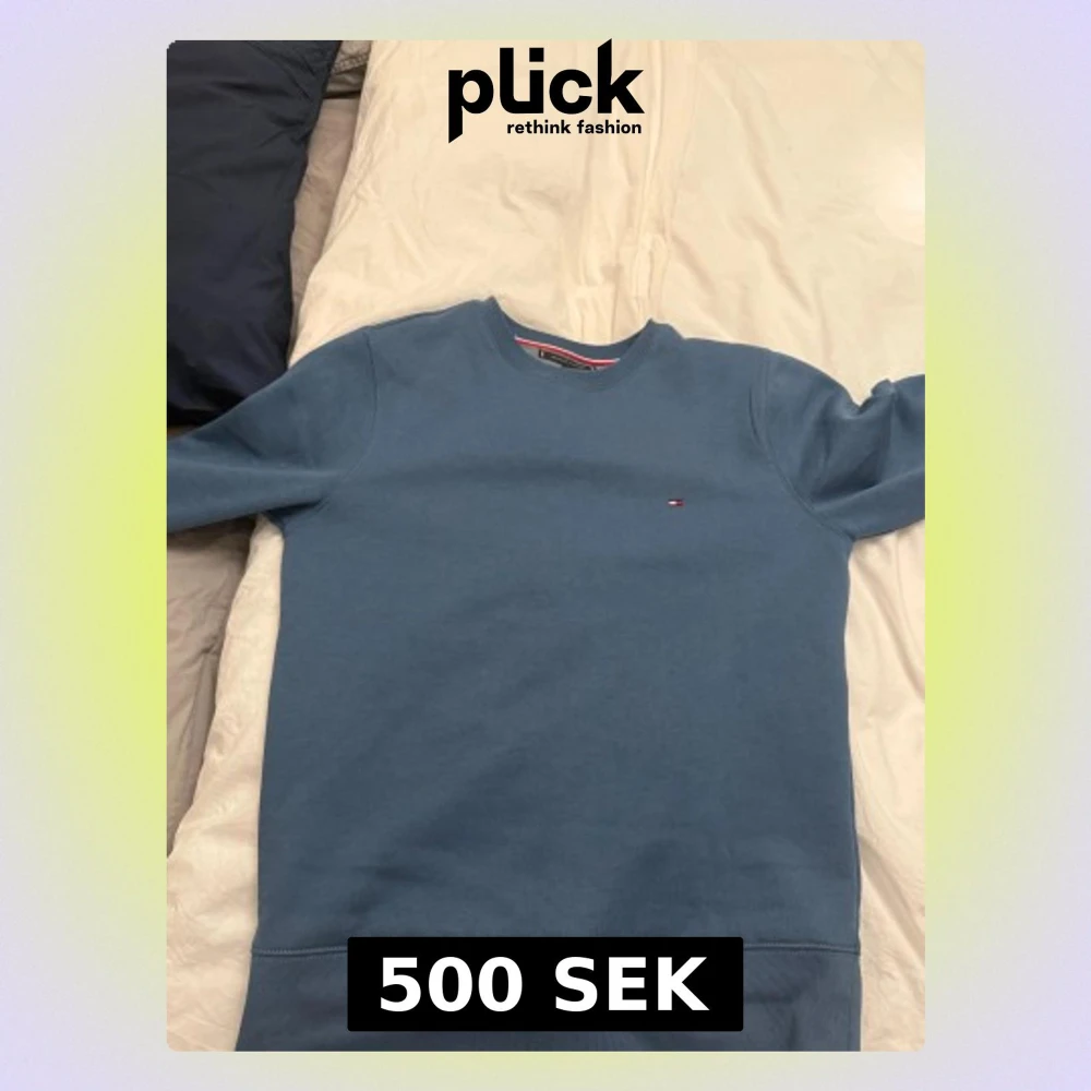 Snygg blå sweatshirt från Tommy Hilfiger i storlek S. Tröjan har rund hals, lång ärm och ett litet broderat Hilfiger-logo på bröstet. Tillverkad i mjuk bomull med ribbade muddar vid ärmslut och nederkant. Perfekt för chill dagar samt när man vill va lite finklädd.