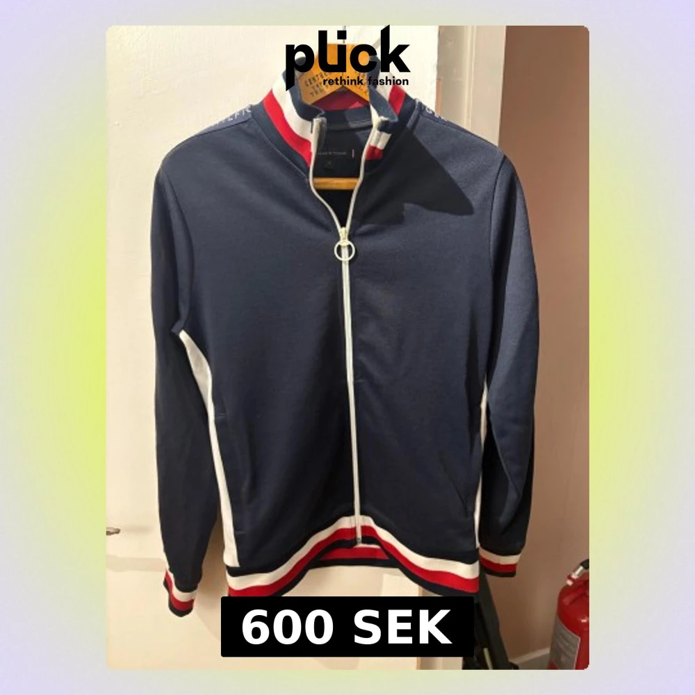Snygg marinblå vindjacka från Tommy Hilfiger med vita och röda ränder på krage, ärmslut och nederkant. Långärmad med vit dragkedja och Hilfiger-logga längs ärmen. Jackan har sportig look och är gjord i polyester.