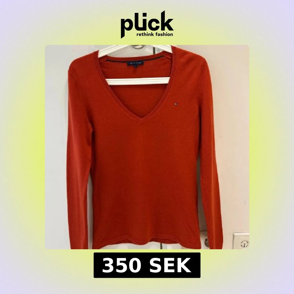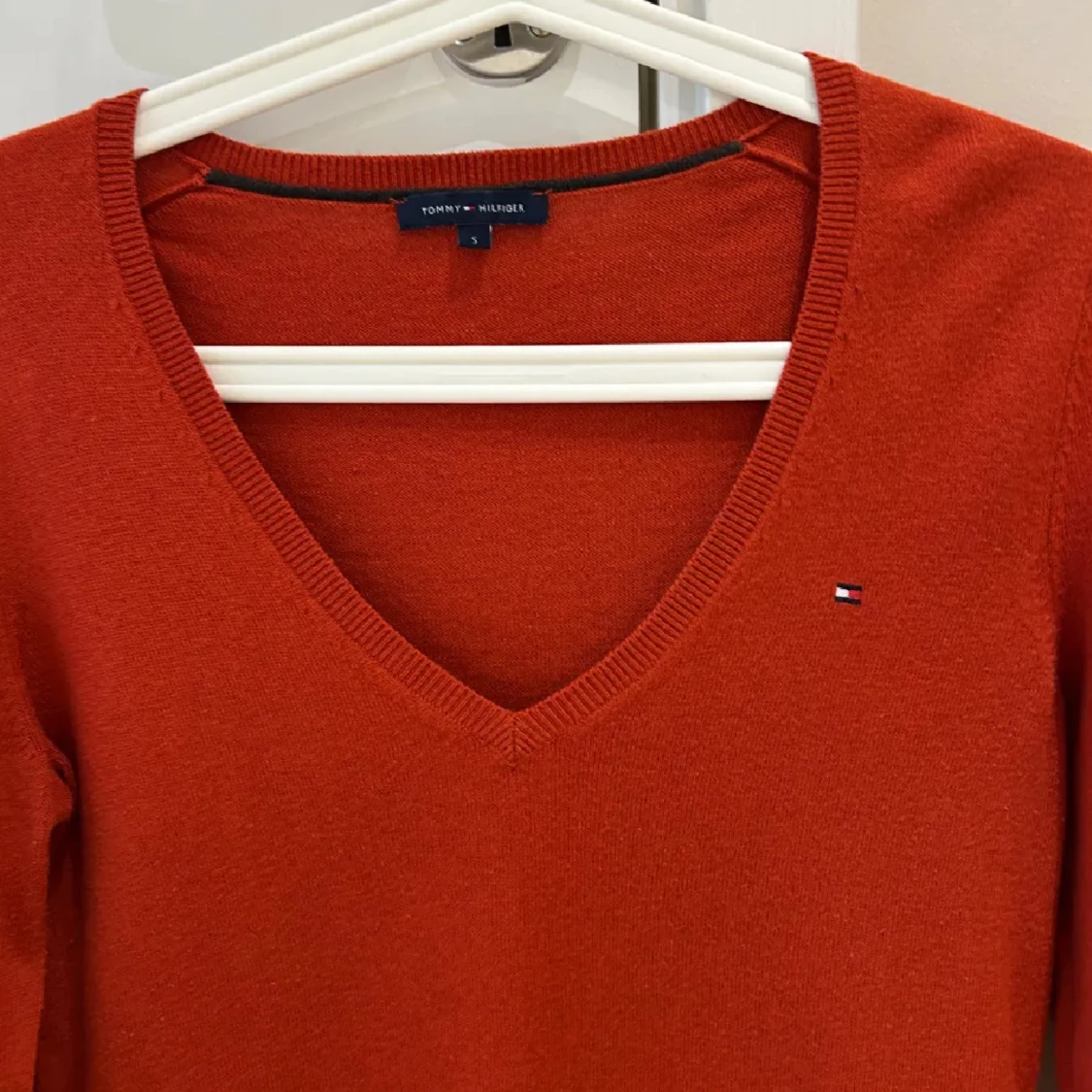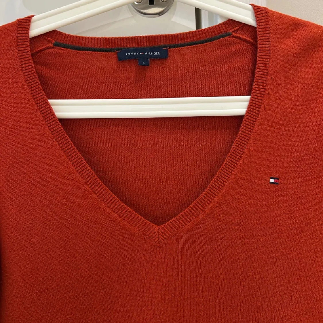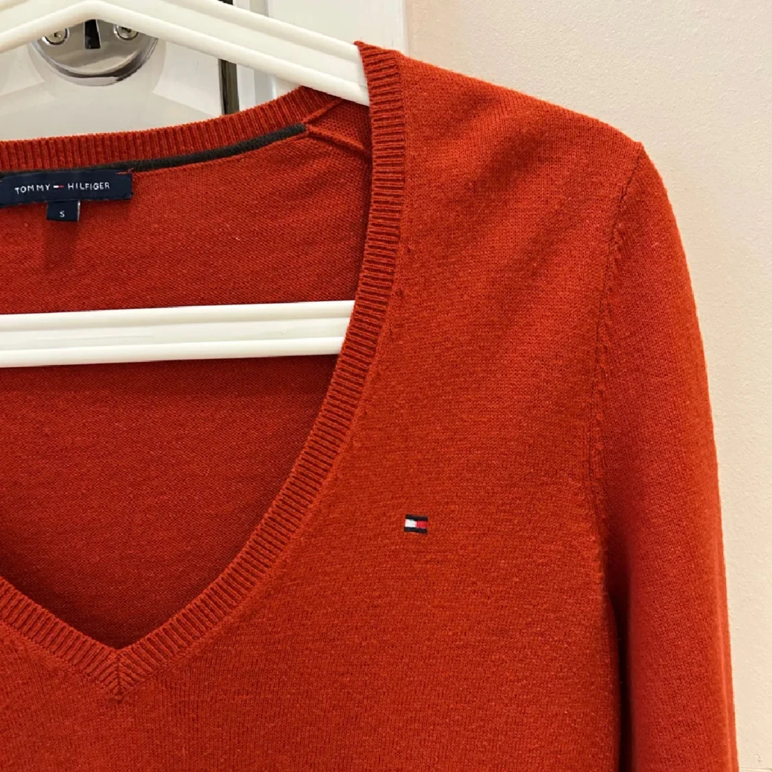 Rostorange v-ringad tröja från Tommy Hilfiger med liten broderad logga på bröstet. Tröjan är långärmad och har en klassisk, smal passform. Materialet är mjukt och stickat, perfekt för lager-på-lager under höst och vinter.