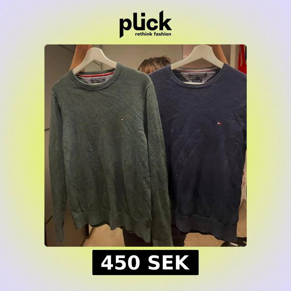 Säljer två stilrena tröjor från Tommy Hilfiger i storlek S. Den ena är grön och den andra är blå, båda med rund hals och små logotyper på bröstet. Lite ostrukna på bilden men inget som inte går att lösa. Perfekta för en avslappnad och snygg look. Mycket bra kvalité och skick.