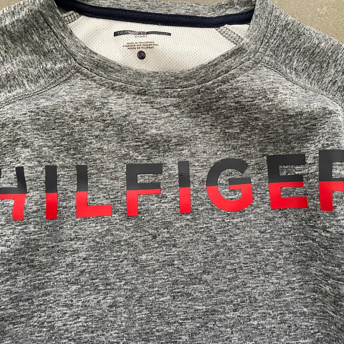 Jättefin tröja från Tommy Hilfiger i ”träningsmaterial”. Storlek Child Large, motsvarar 134/140 i svensk storlek. Blåmelerad.