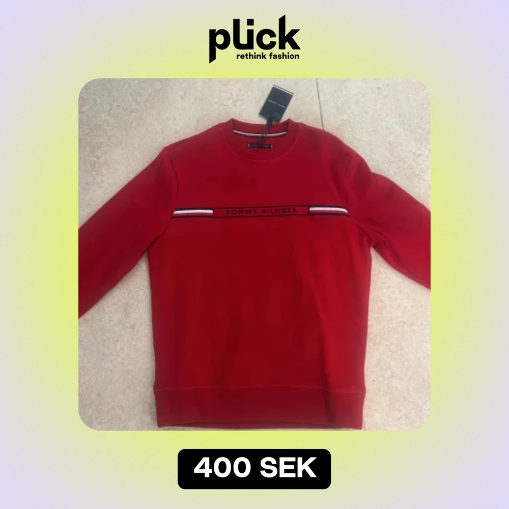 Storlek M rödfärgad tröja med Tommy hilfigher tryck på framsidan. Snygg passform. Etiketten sitter fortfarande på och tröjan har ej använts.