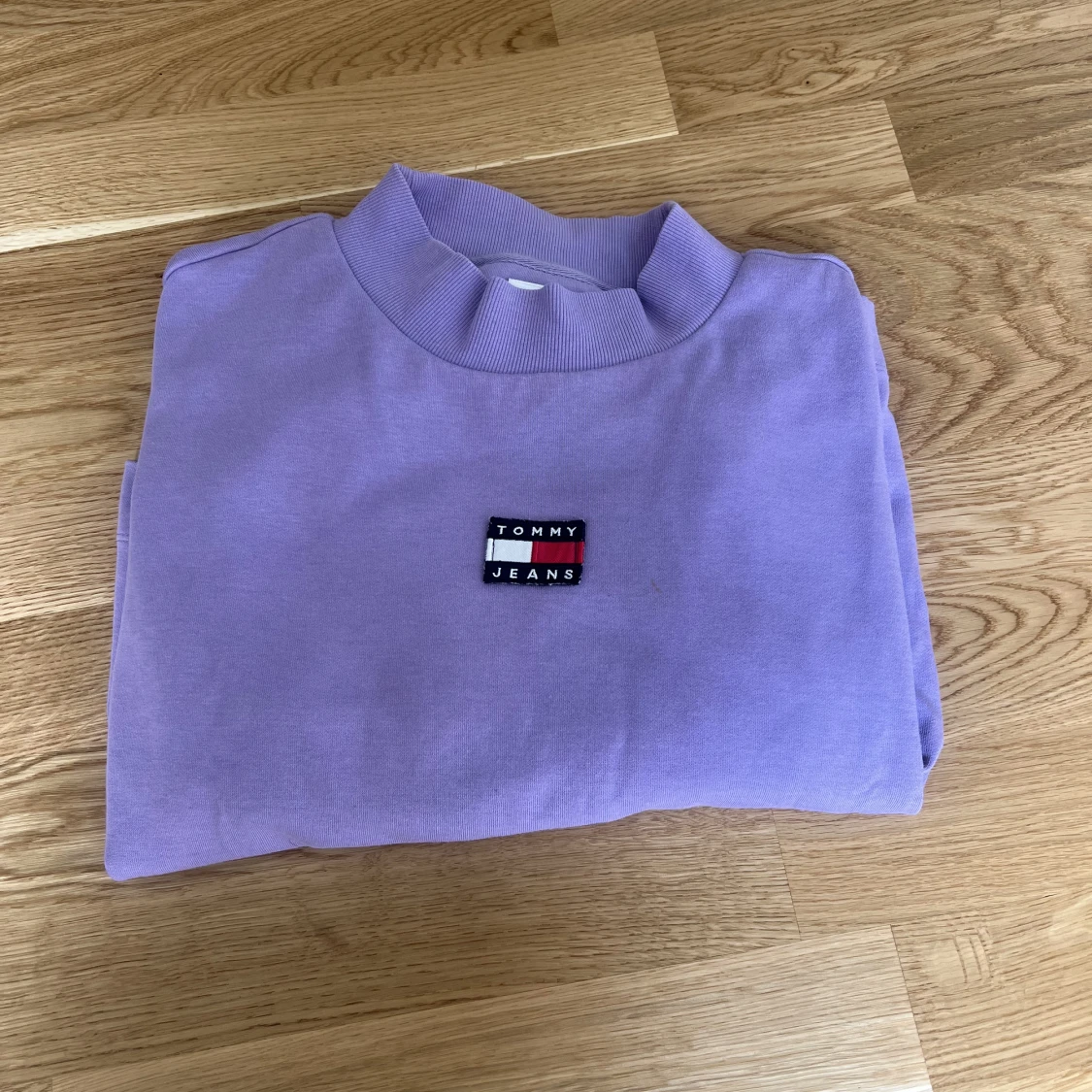 En snygg lila croppad sweatshirt ifrån Tommy Jeans i storlek L. En pytte pytteliten fläck som knappt syns. Kan skicka mer bilder vid intresse.