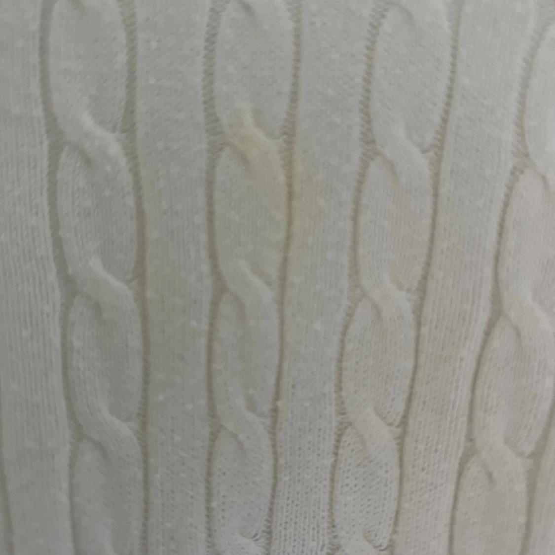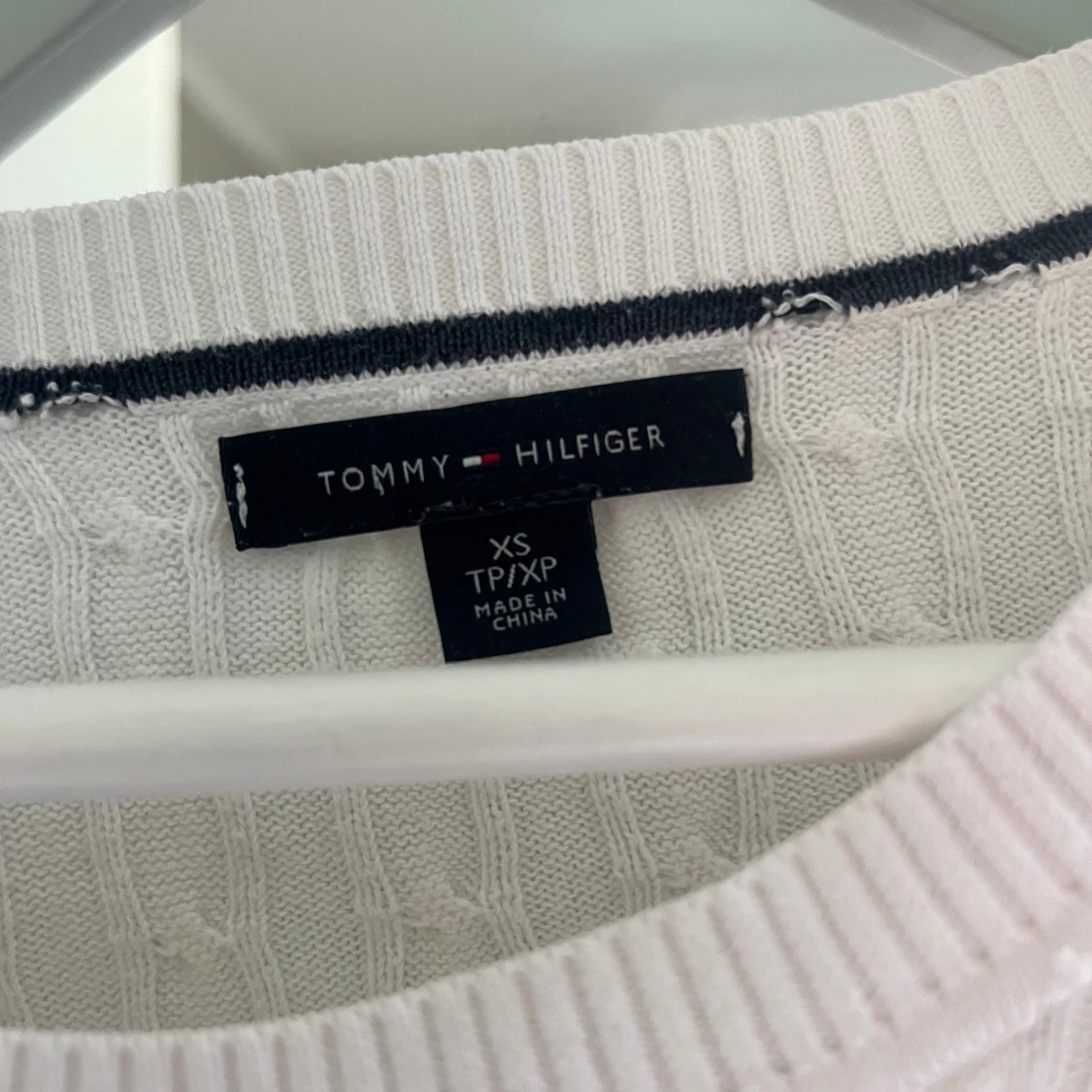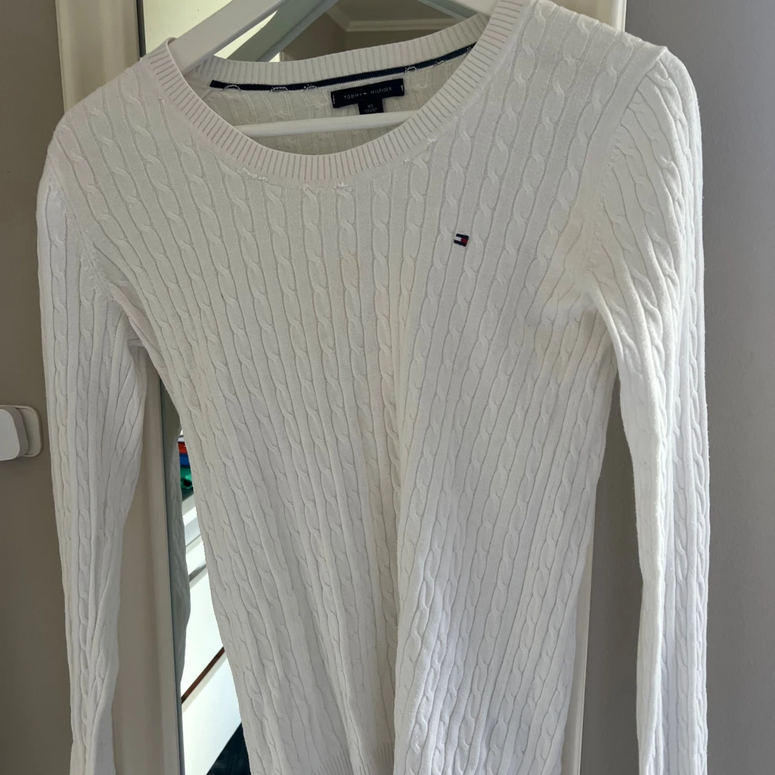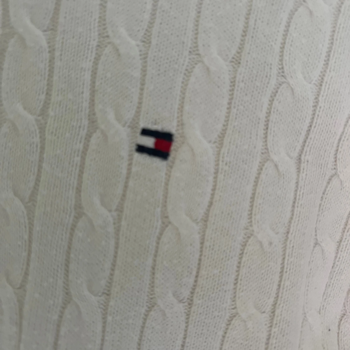 Vit kabelstickad tröja från Tommy Hilfiger i klassisk modell med rund halsringning och diskret logga på bröstet. Långärmad och i mjuk bomull, perfekt för lager-på-lager och snygg till jeans eller kjol. Tröjan har en liten gulaktig fläck (se bild 3) syns knappt men därav priset