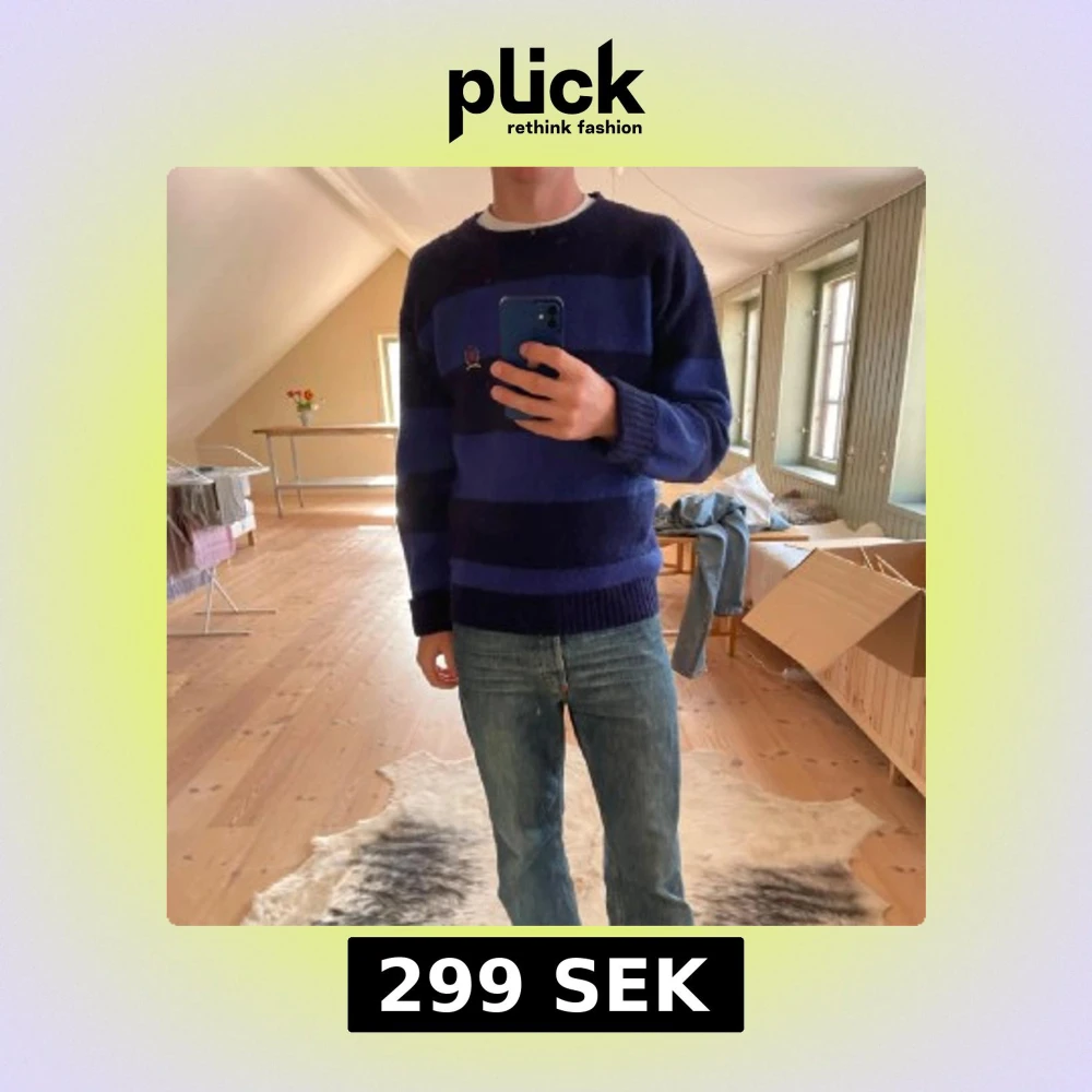 Säljer en snygg blå och svart randig tröja med långa ärmar. Den är i bra skick och inte så använd!