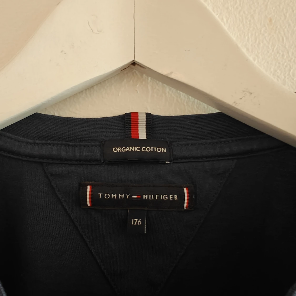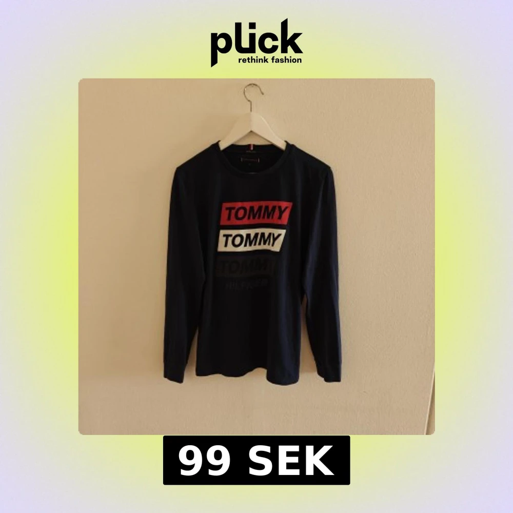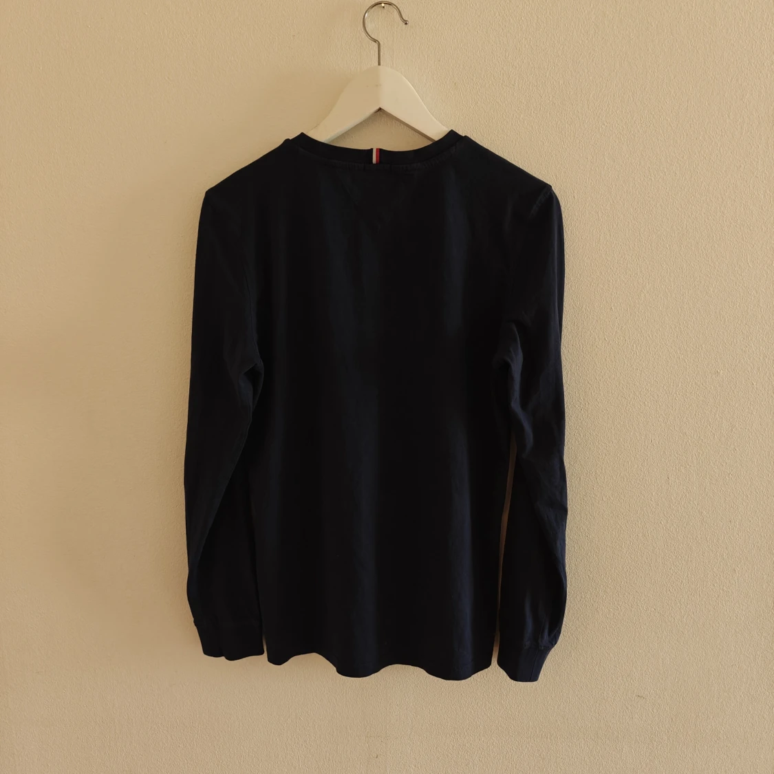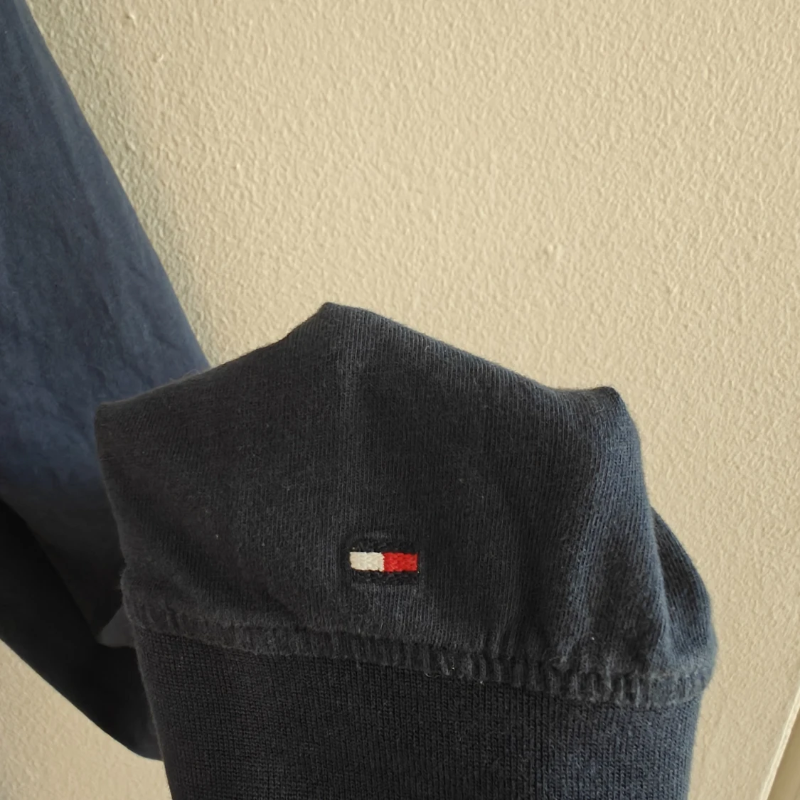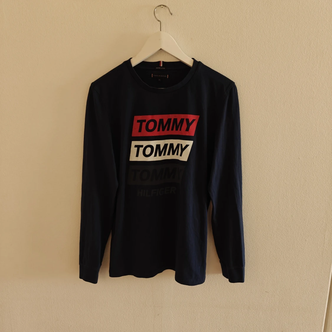 Snygg mörkblå långärmad tröja från Tommy Hilfiger med tryck i rött, vitt och svart på bröstet. Tillverkad i 100% ekologisk bomull, rund hals och klassisk passform. Perfekt för dig som gillar stilrena logotröjor med street-vibe.