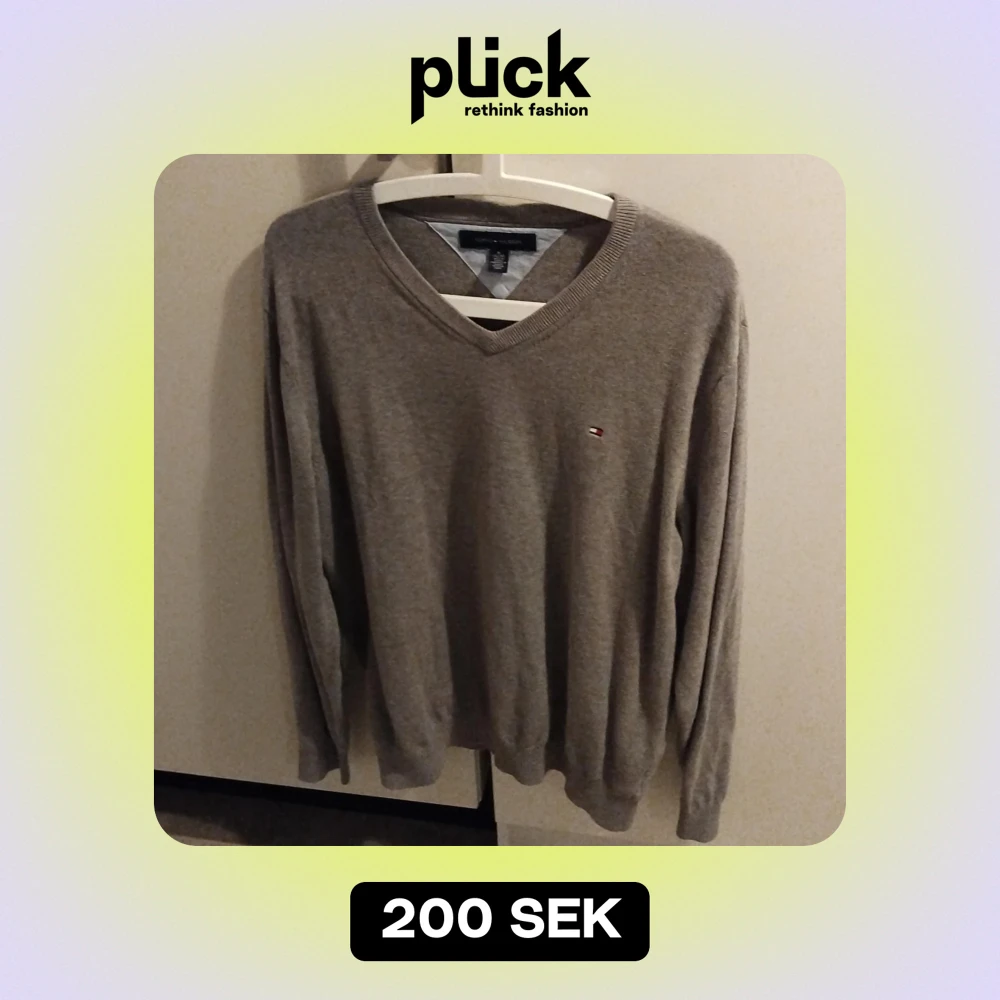 Säljer en snygg beige tröja från Tommy Hilfiger i bra skick. Den har en klassisk v-ringning och långa ärmar, perfekt för både höst och vår. Tröjan är mjuk och bekväm, idealisk för en stilren vardagslook.
