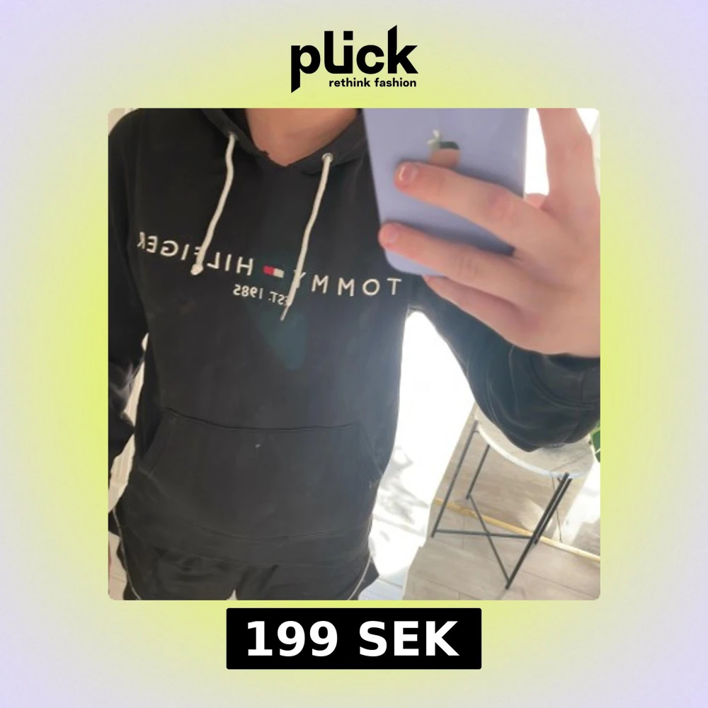 Säljer en svart hoodie från Tommy Hilfiger med vit logga och text på bröstet. Tröjan har huva med vita snören och en stor magficka. Perfekt för en avslappnad stil.