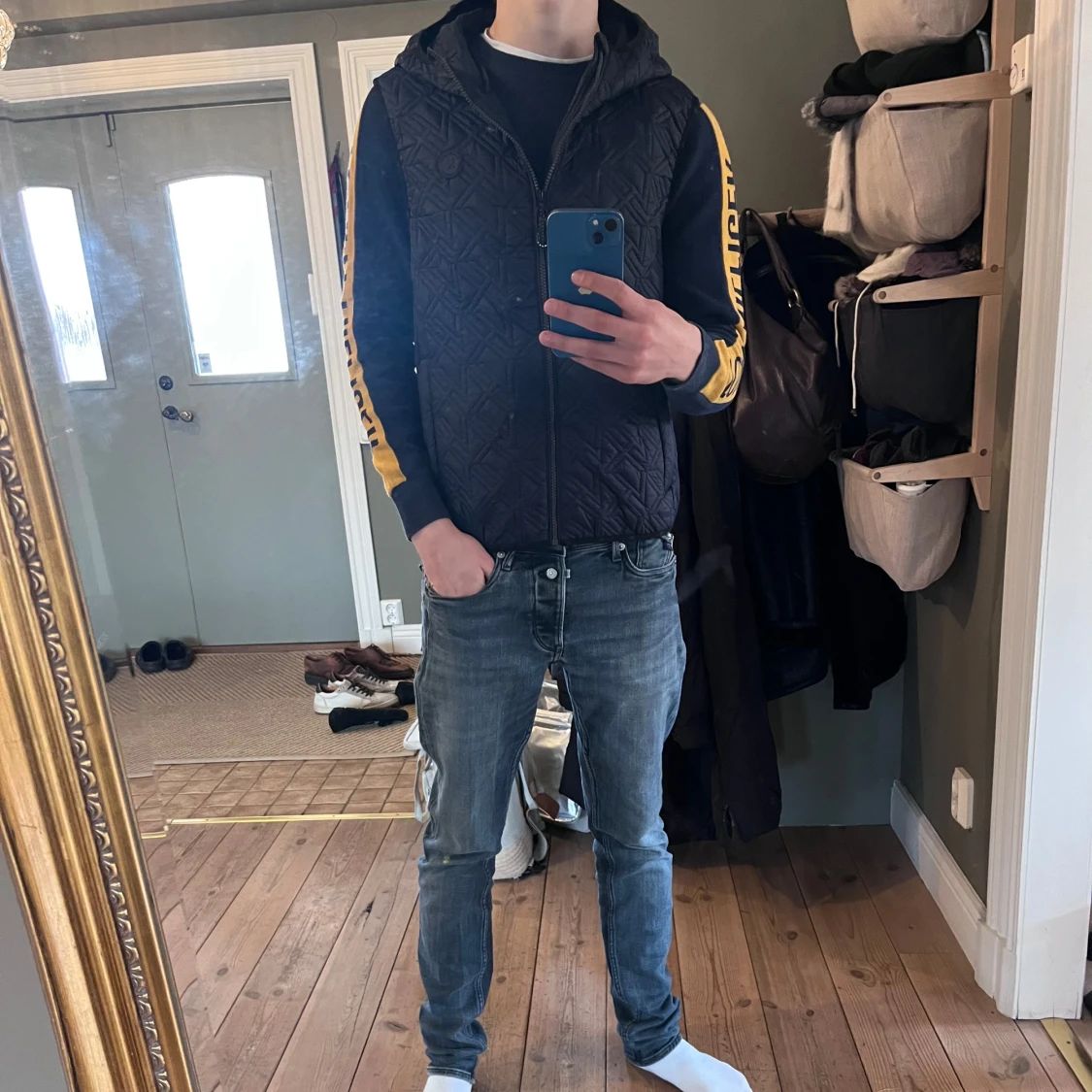 Säljer en blå långärmad tröja från Tommy Hilfiger med gula ränder och logotyp längs ärmarna. Klassisk rund halsringning och liten broderad logga på bröstet. Super snygg att stylea med väst🤩