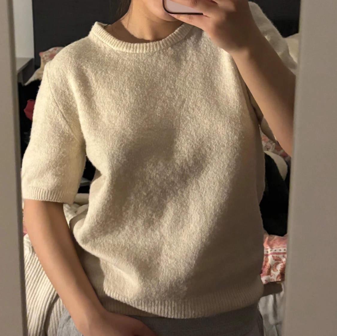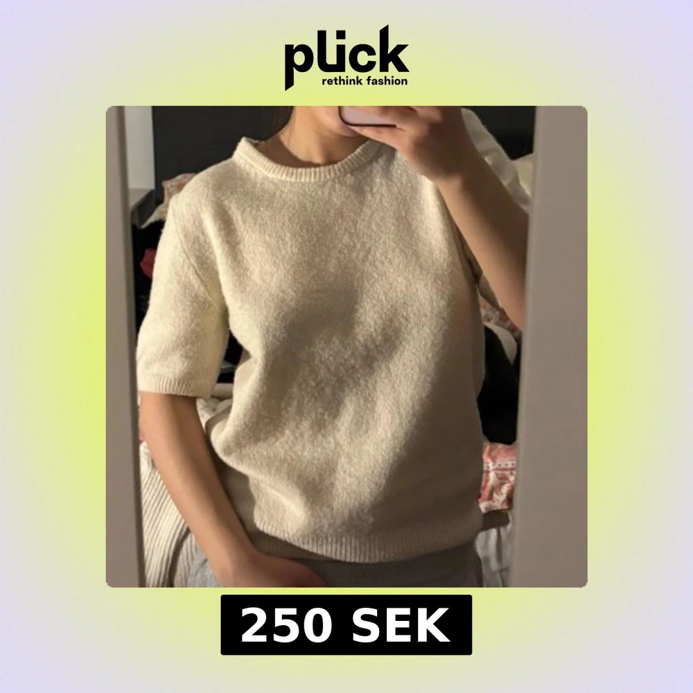 Mysig vit stickad tröja med korta ärmar och rund halsringning. Tröjan har en enkel och stilren design, perfekt för lager-på-lager eller som den är. Passformen är normal och materialet känns mjukt mot huden.