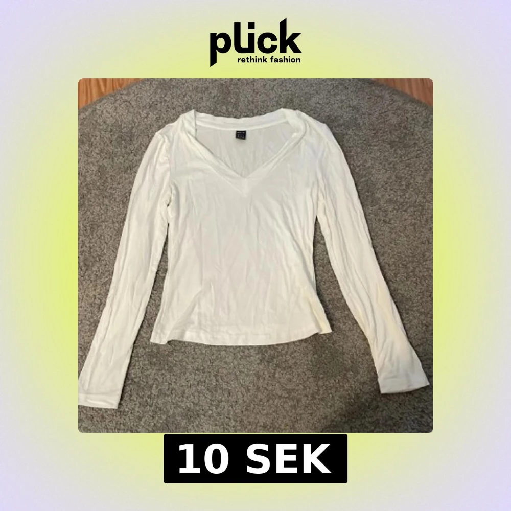 En basic vit långärmad topp från Shein i storlek XS. Toppen har en snygg v-ringning och är figurnära i modellen. Perfekt att styla med jeans eller kjol för en clean look. Materialet är mjukt och stretchigt, vilket gör den bekväm att bära hela dagen.