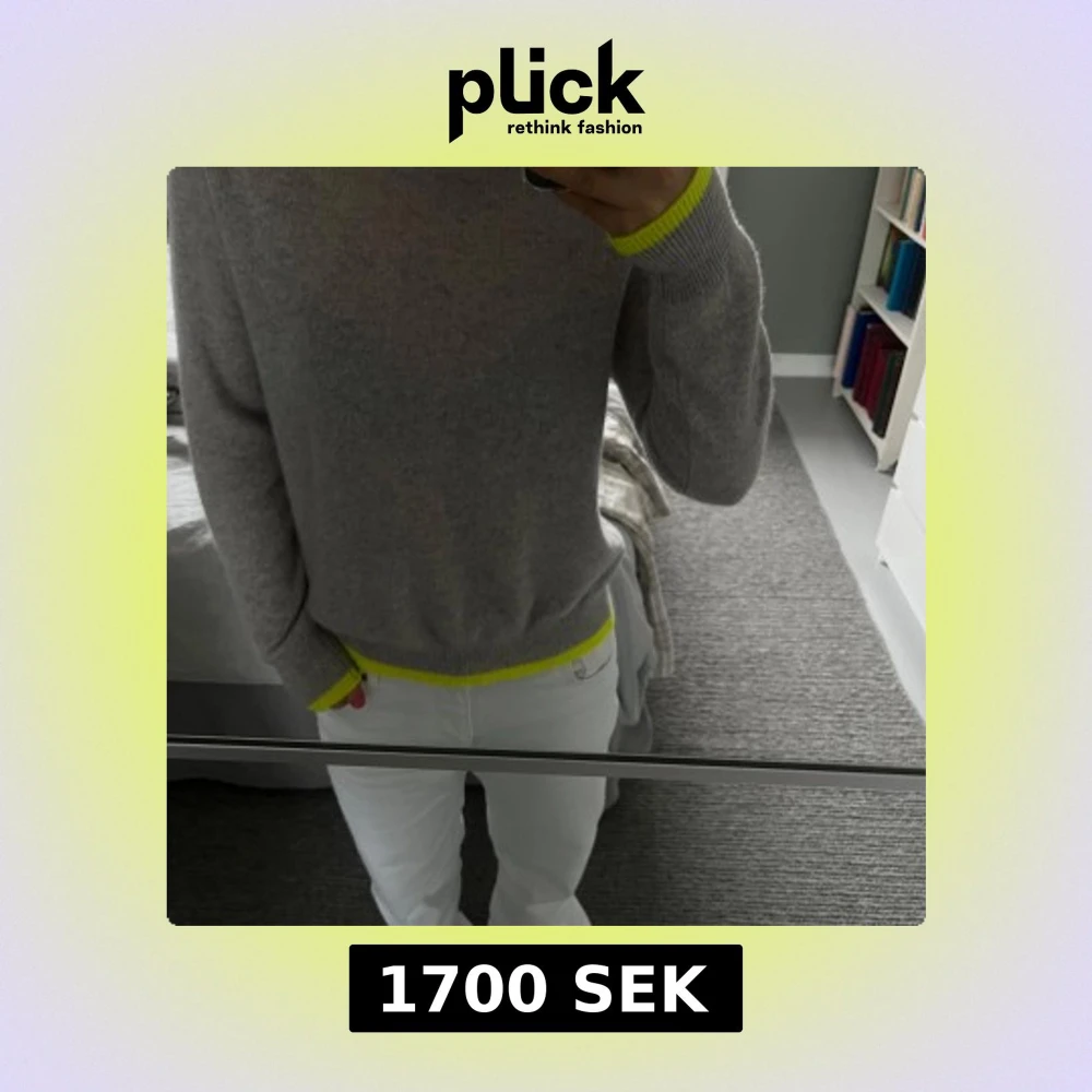 Säljer en mjuk grå kashmirtröja med huva från From Future. Tröjan har neongula detaljer vid ärmslut och nederkant som ger en cool kontrast. Aldrig använd, nypris 2400