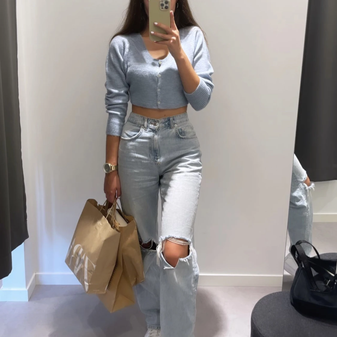 Säljer denna supersöta stickade toppen från mango. Den är använd endast en gång då på bilden 🤍