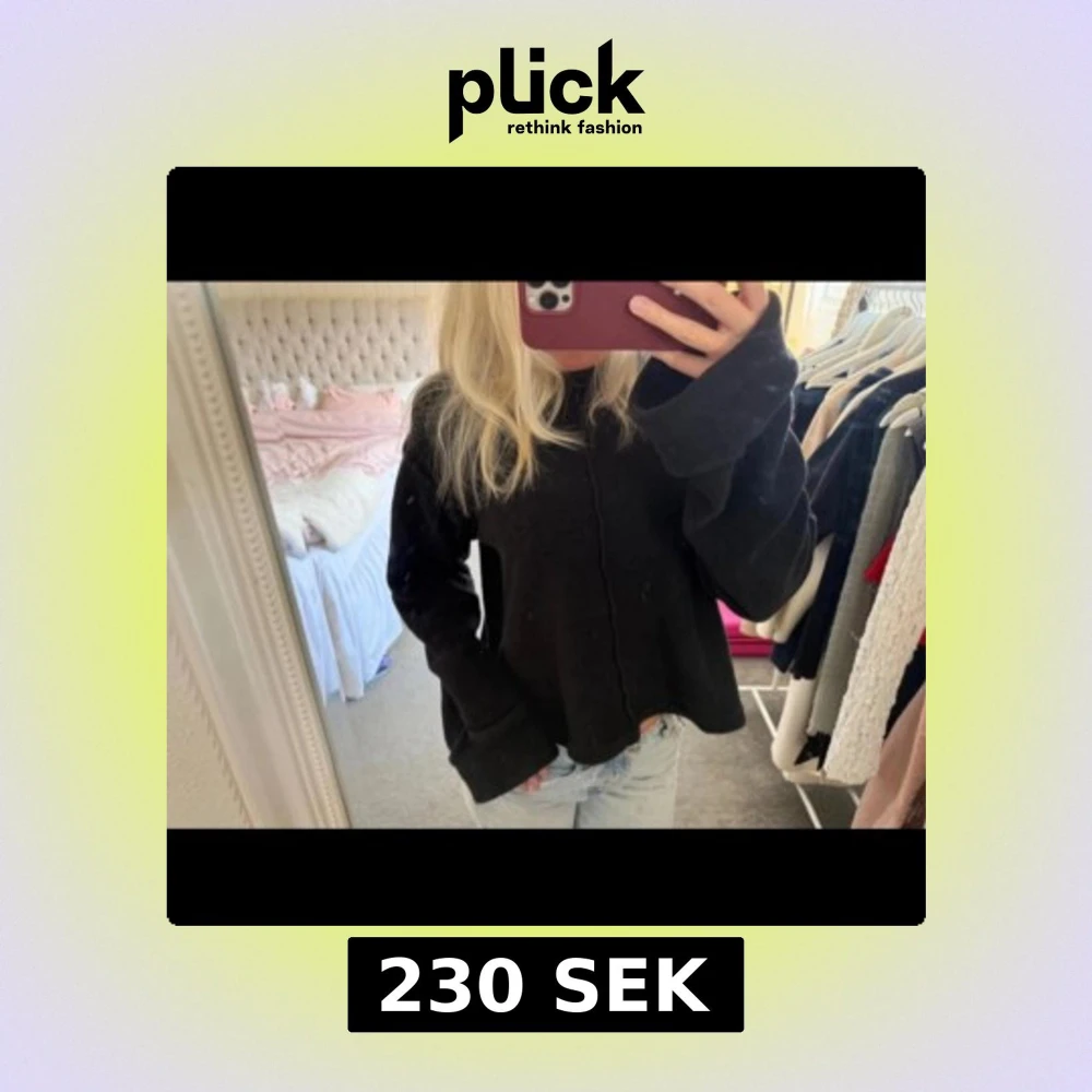 En svart stickad tröja med breda ärmslut och synlig söm framtill. Tröjan har en loose passform och rund halsringning, perfekt att slänga på sig till jeans. Enkel och stilren design som funkar året runt.