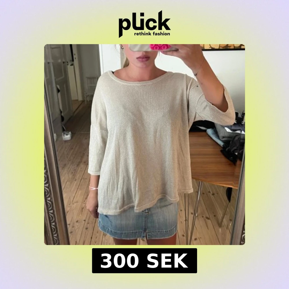 Säljer en guld glittrig topp med trekvartsärm och lös passform. Toppen har rund halsringning och ett lätt skimrande material som ger en snygg touch till outfiten. Perfekt att styla med jeans eller kjol för en trendig look.