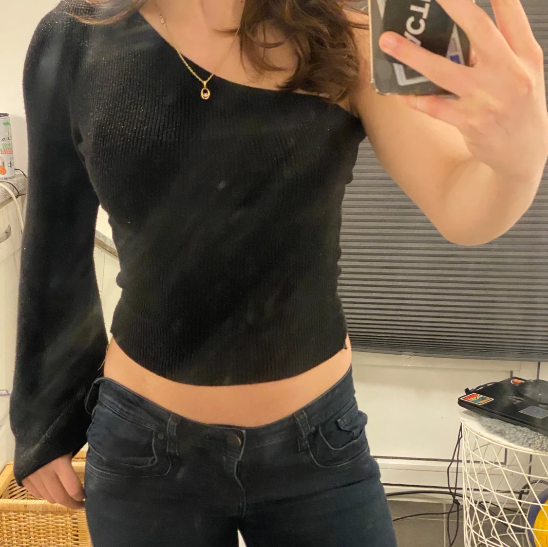 Snygg svart oneshoulder topp med lång ärm och croppad design. Perfekt för en trendig look. Sytt in midjan själv!