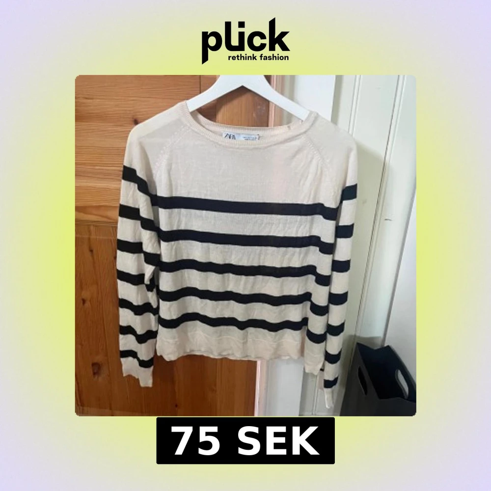 Snygg beige tröja från Zara med svarta horisontella ränder. Tröjan har rund halsringning och långa ärmar. Perfekt för lager-på-lager och passar till både jeans och kjol. Tunn och mjuk i materialet.