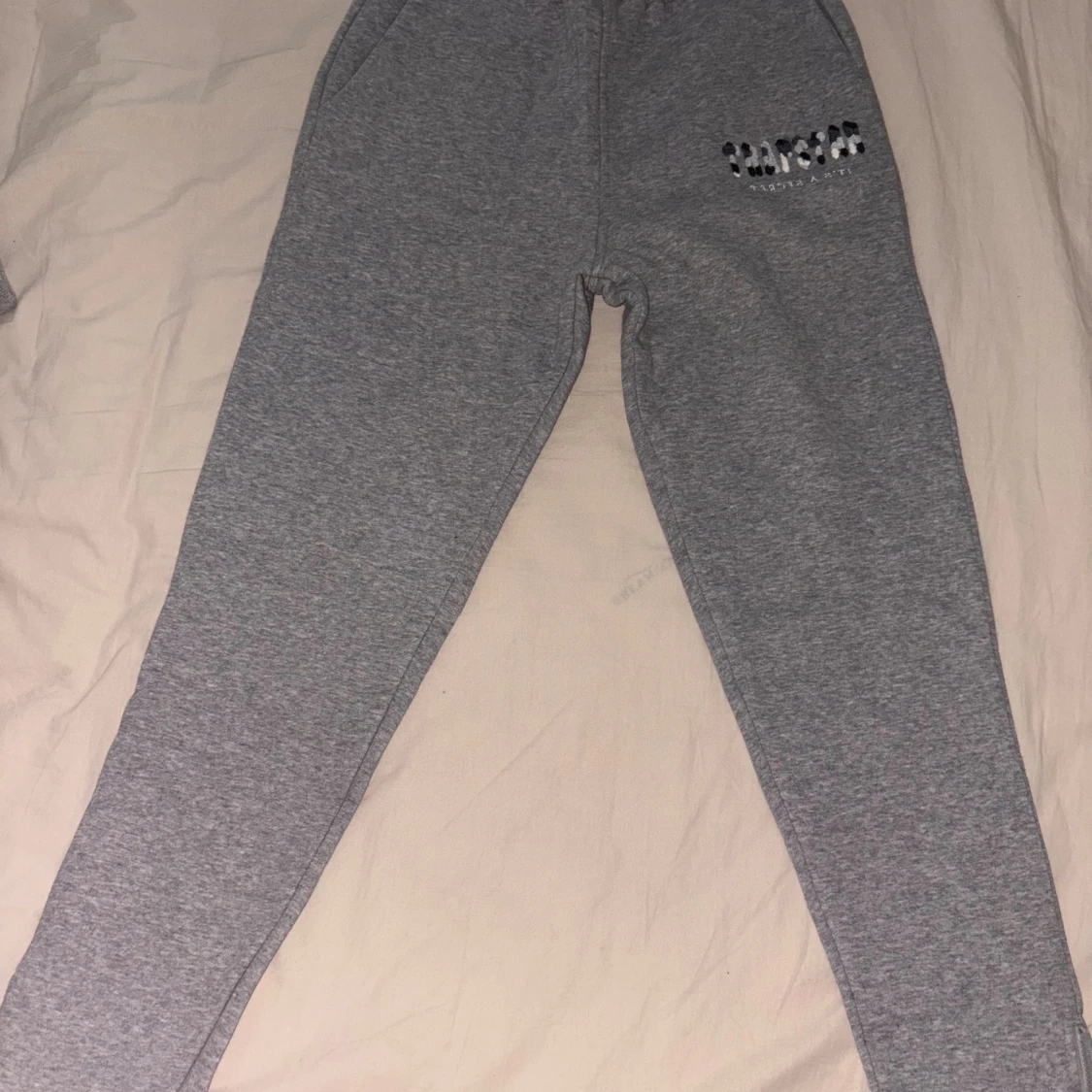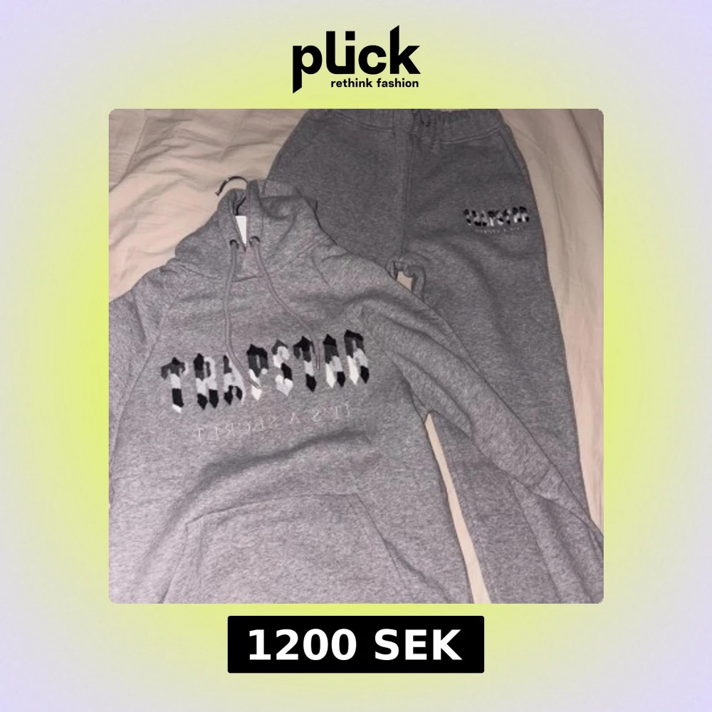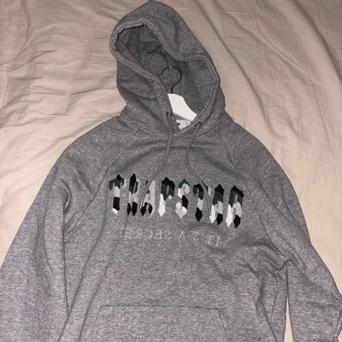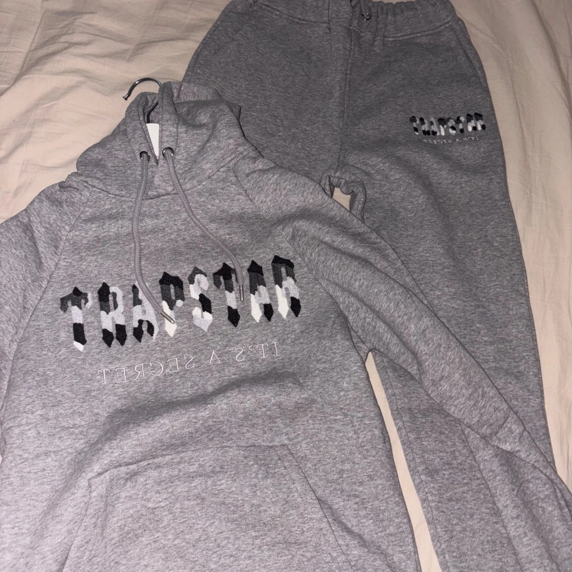 Säljer en grå hoodie från Trapstar med svart, vit och gråt mönstrat tryck på bröstet och texten 'IT'S A SECRET' under. Hoodien har snörning i huvan, magficka och långa ärmar. Perfekt för chill dagar och streetwear-stil.