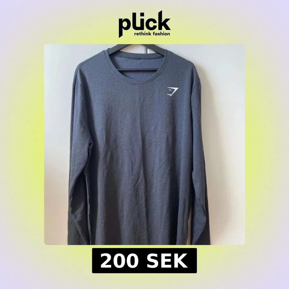 Säljer en stilren mörkgrå långärmad tröja från Gymshark med rund halsringning och diskret logga på bröstet. Perfekt för dig som gillar enkel och sportig stil. Skön passform och mjukt material.