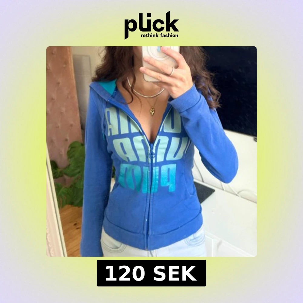 Blå hoodie från Puma med stort turkost tryck framtill. Tröjan har dragkedja, huva med turkos insida och långa ärmar. Materialet är mjukt och skönt, perfekt för chill eller träning. Två små vita fläckar på armen