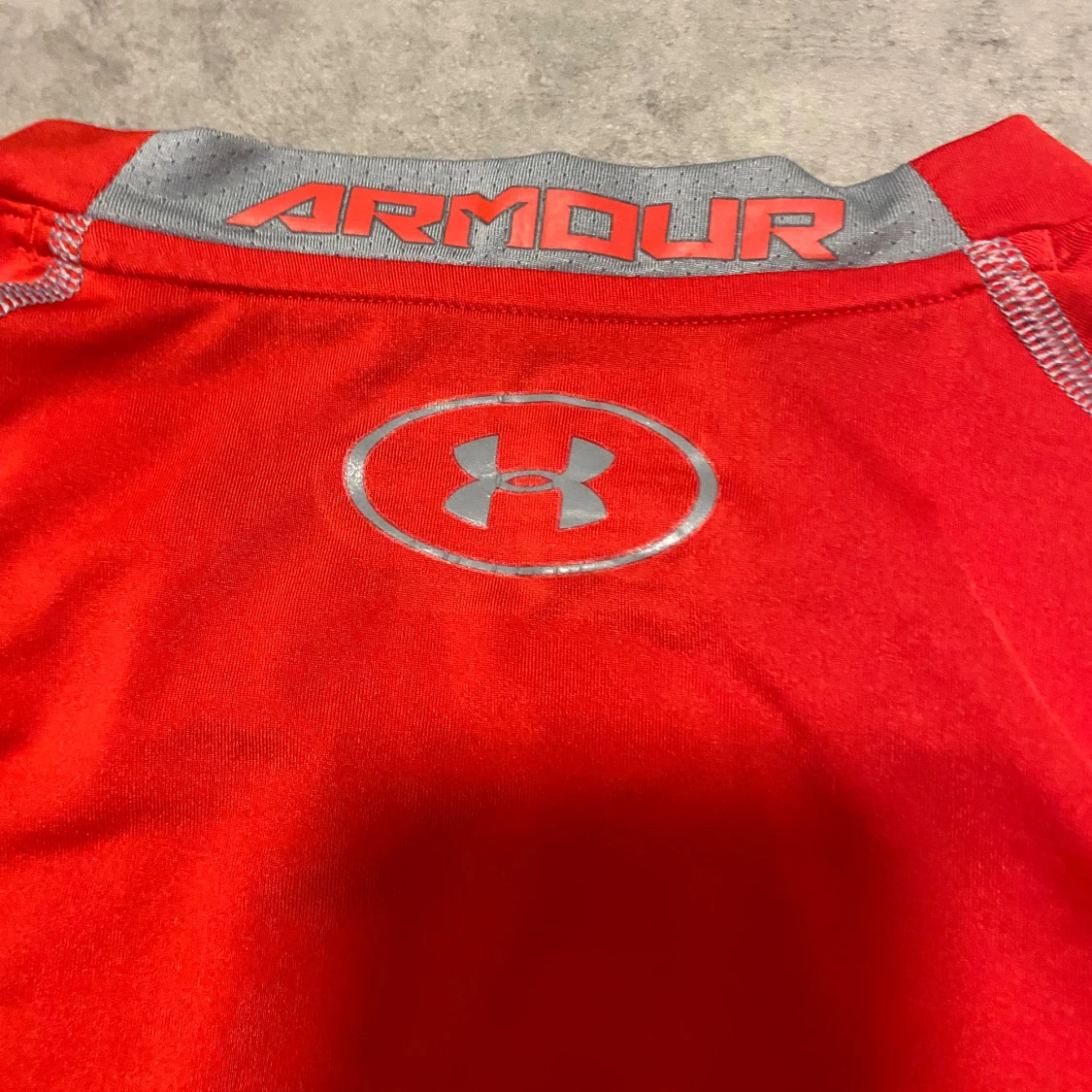 Säljer en röd långärmad kompressionströja från Under Armour med gråa detaljer och logga på bröstet och ryggen. Tröjan är tillverkad i ett syntetmaterial som andas och passar perfekt för träning. Tight passform och cool design.