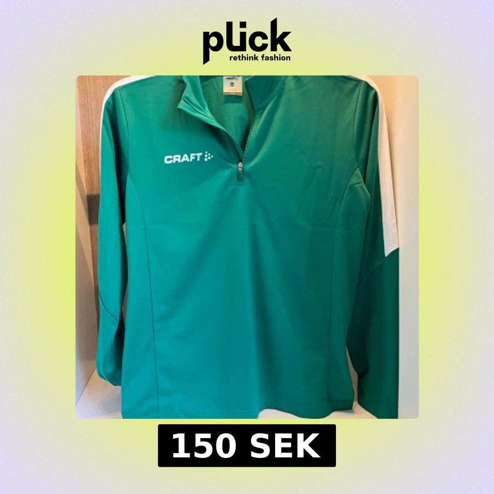 Säljer en grön långärmad träningströja från Craft med vit logga på bröstet och vita detaljer längs axlarna. Tröjan har halv dragkedja framtill och är tillverkad i ett syntetmaterial som passar perfekt för sport och aktivitet. Helt ny. By pris 449