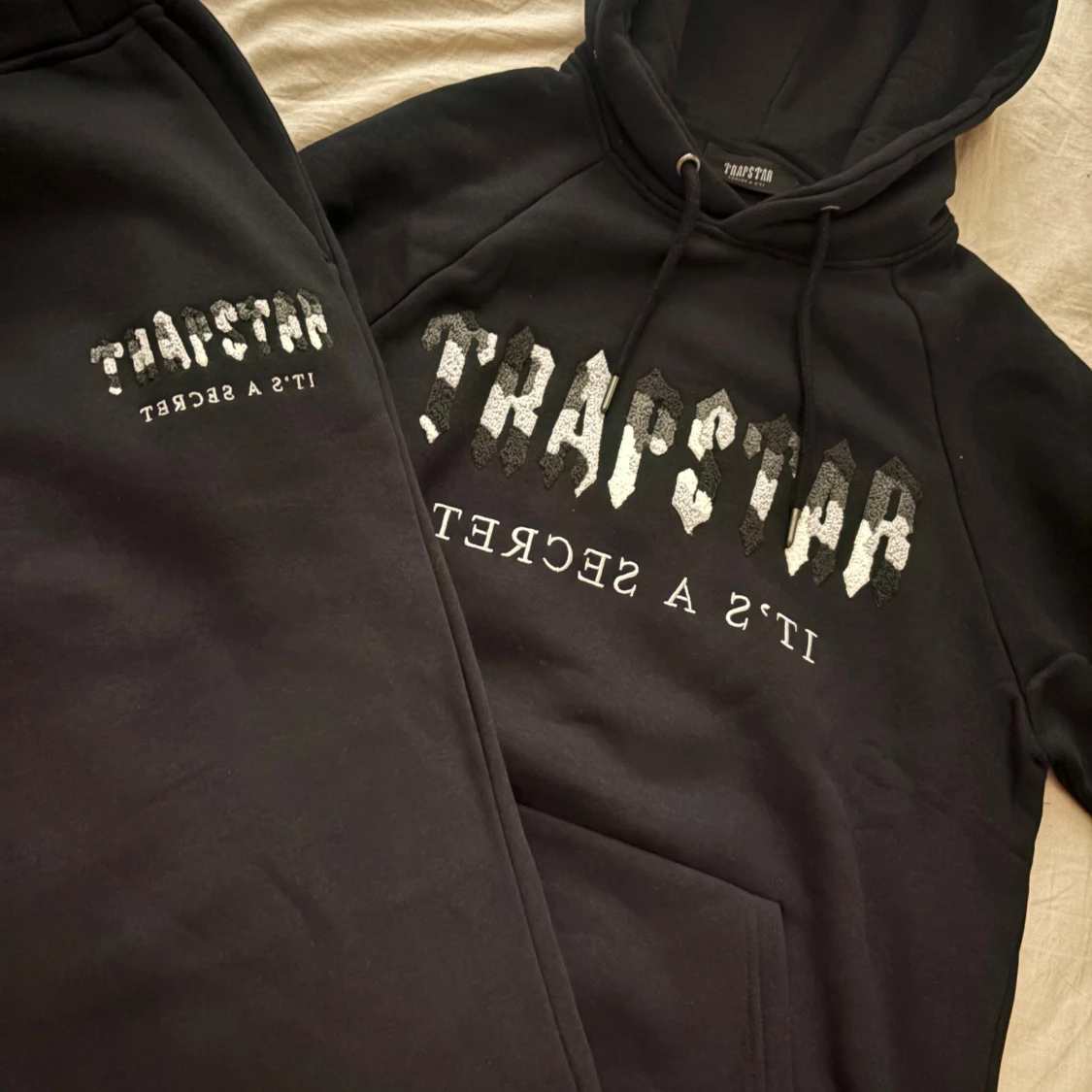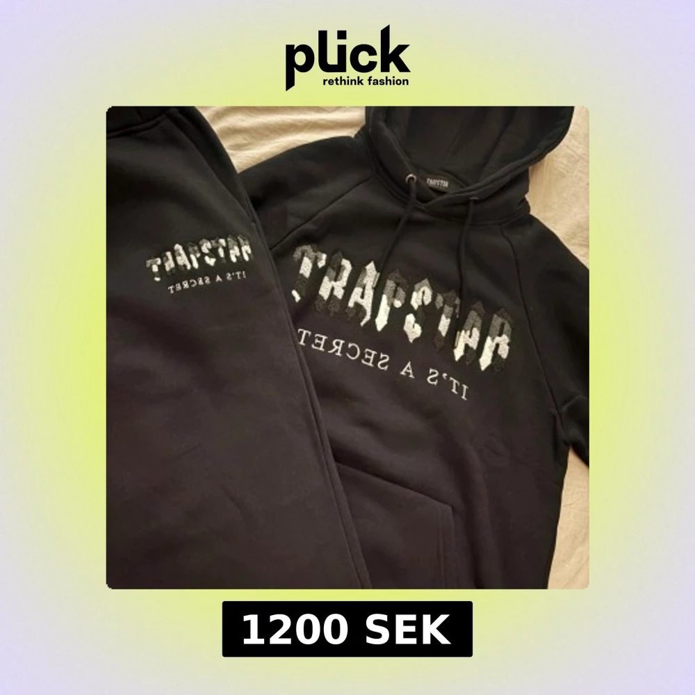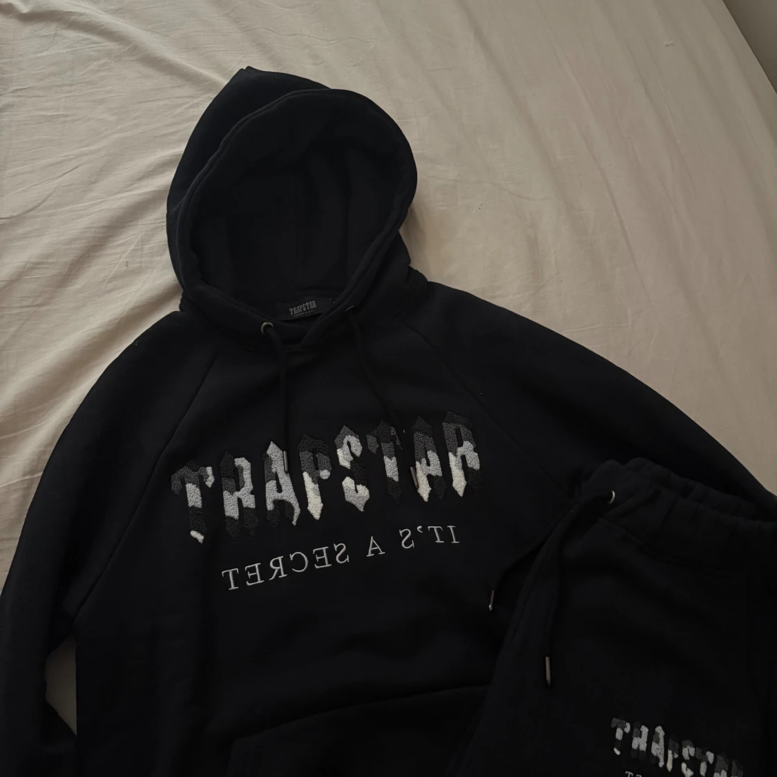 Säljer en svart hoodie från Trapstar med fet broderad logga och texten 'IT'S A SECRET' på bröstet. Hoodien har snörning i huvan och är gjord i mjuk bomullsmix. Perfekt för dig som gillar streetwear och vill sticka ut med en ikonisk look.