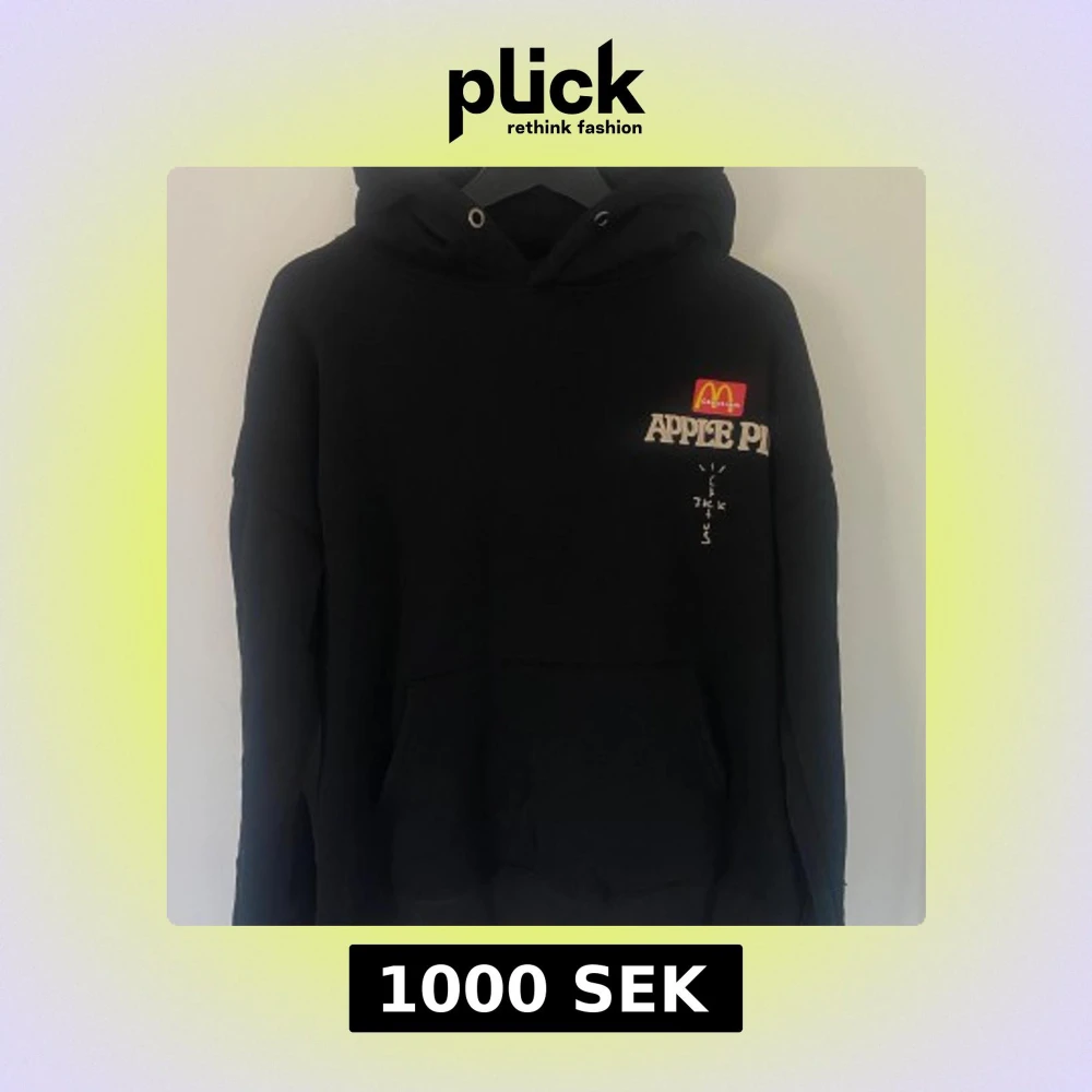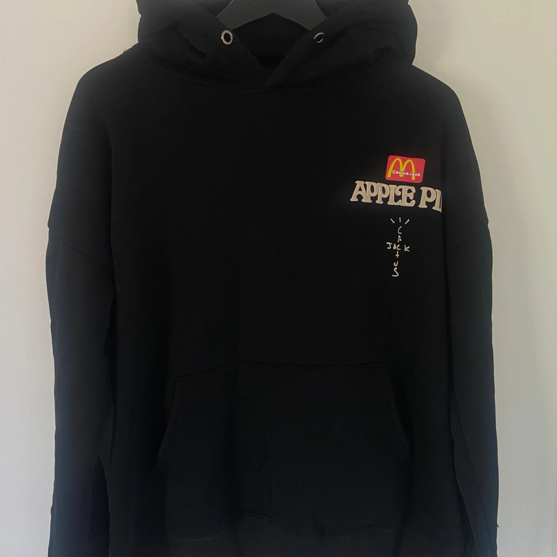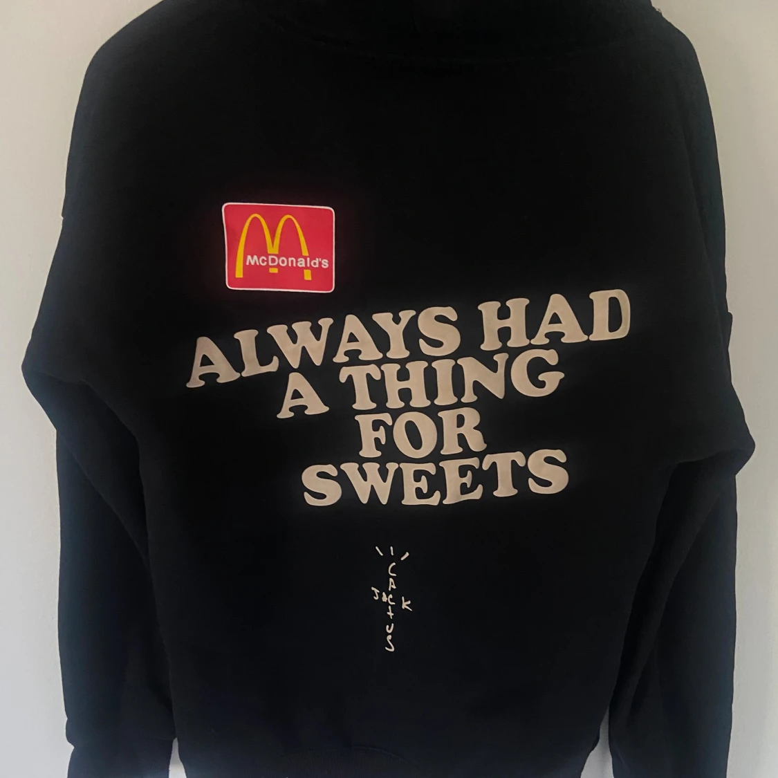 Svart hoodie med McDonald's-logga och texten 'APPLE PIE' som referens till hans låt, samt 'ALWAYS HAD A THING FOR SWEETS' på ryggen. Cactus Jack-tryck på både fram- och baksida. Klassisk känguruficka och huva med snörning. Perfekt statement-plagg för streetwear. Från Travis Scott x McDonald’s collaben.