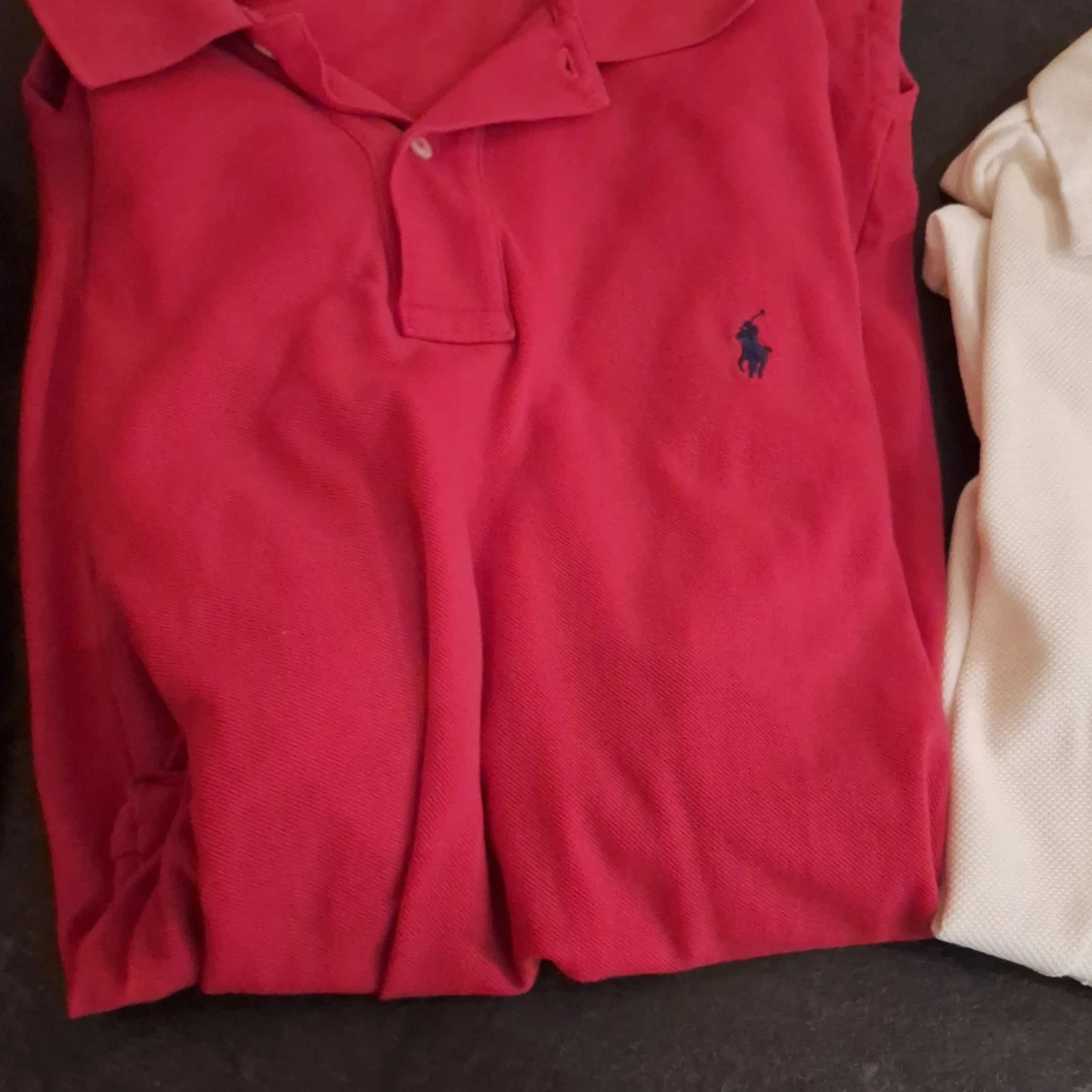 Säljer tre snygga pikétröjor i olika färger. En vit, en röd från Ralph Lauren med blå logga, och en blå från Gant med broderad logga.