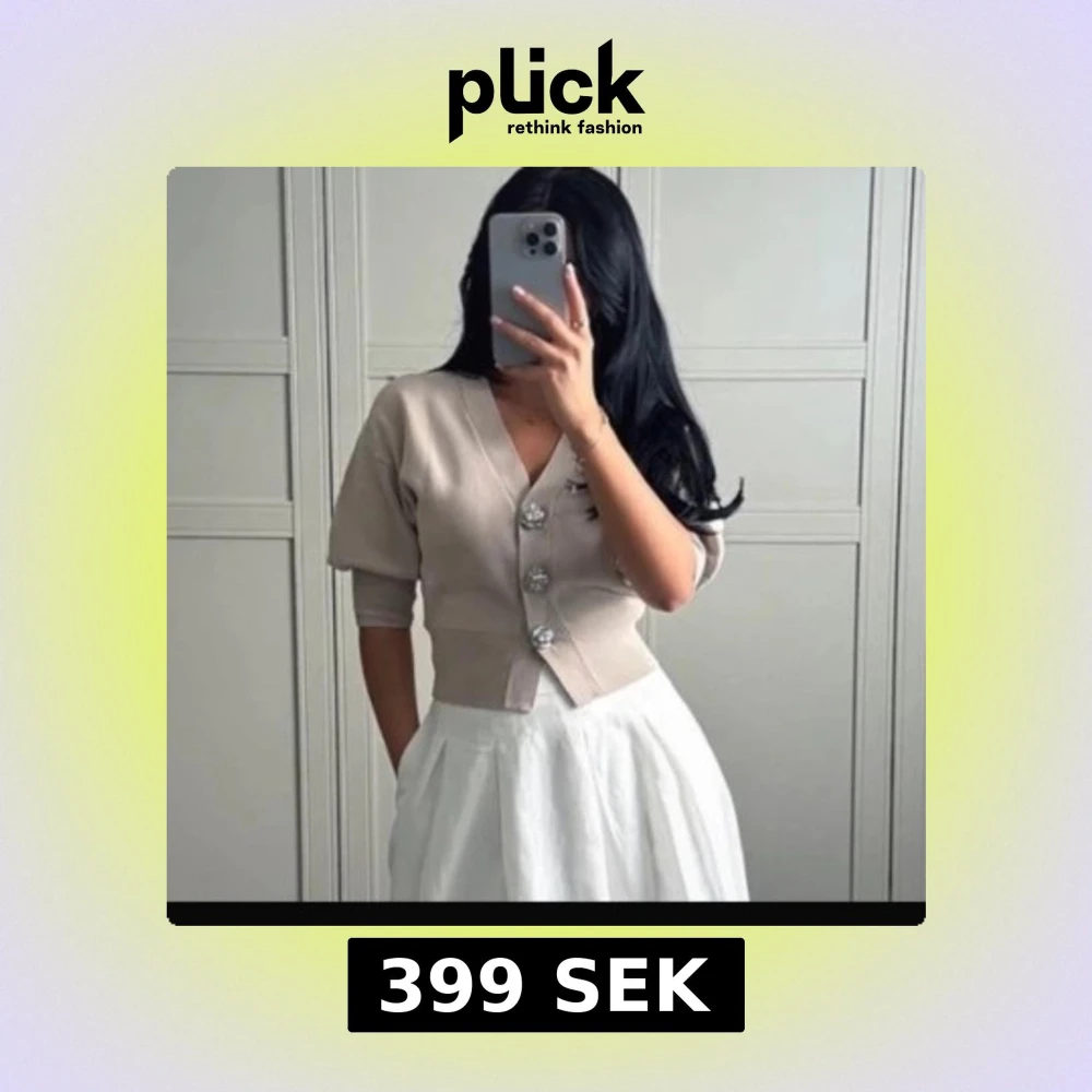 Snygg beige kofta med stora dekorativa knappar framtill. Koftan har korta ärmar och en v-ringad design som ger en stilren look. Perfekt för att lägga till en touch av elegans till din outfit. Mycket bra skick