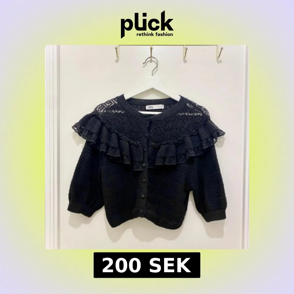 Trekvartsärmad kofta från Zara med vackra volangdetaljer och spetsmönster. I nytt skick förutom ett litet hål vid ärmen på bild 4💓