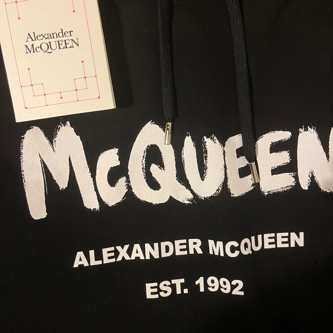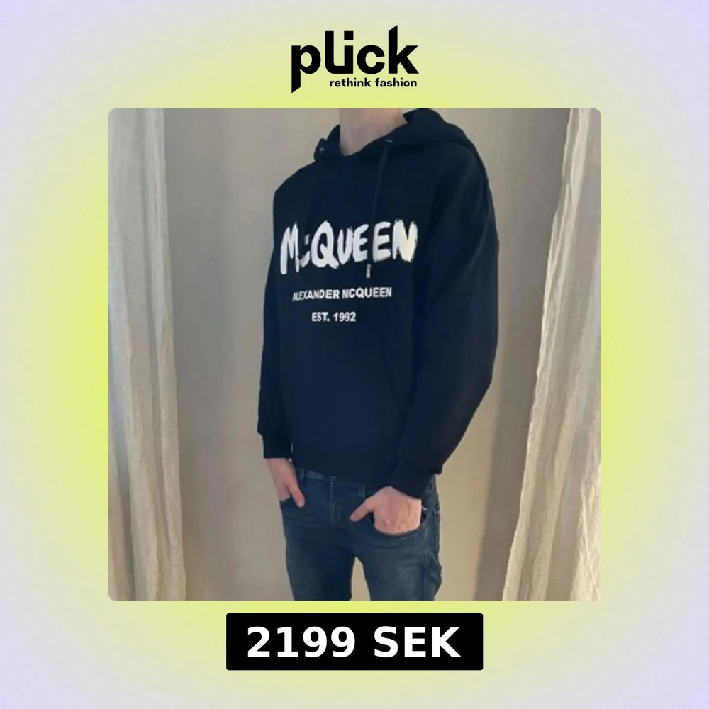 Säljer en stilren svart hoodie från Alexander McQueen med vit logotyp och text 'EST. 1992' på framsidan. Hoodien har en klassisk design med dragsko i huvan och ribbade muddar vid ärmslut och nederkant. Perfekt för en avslappnad look. Hör av dig vid frågor eller funderingar.