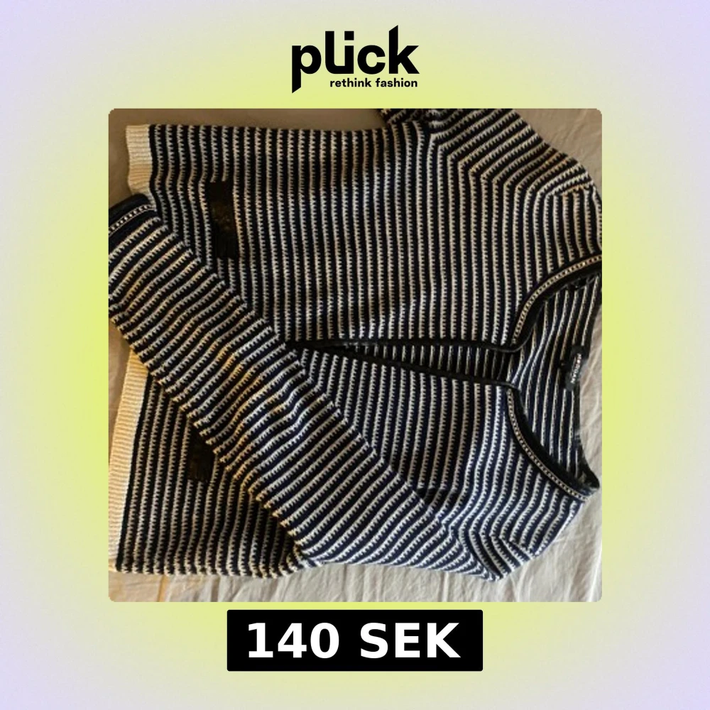 Söt randig kofta med ”skinn (ej äkta)” detalj. Liten knäppning, något lös men går enkelt att sy på starkare. Från Morgan! 😊storlek L men är snarare en S.