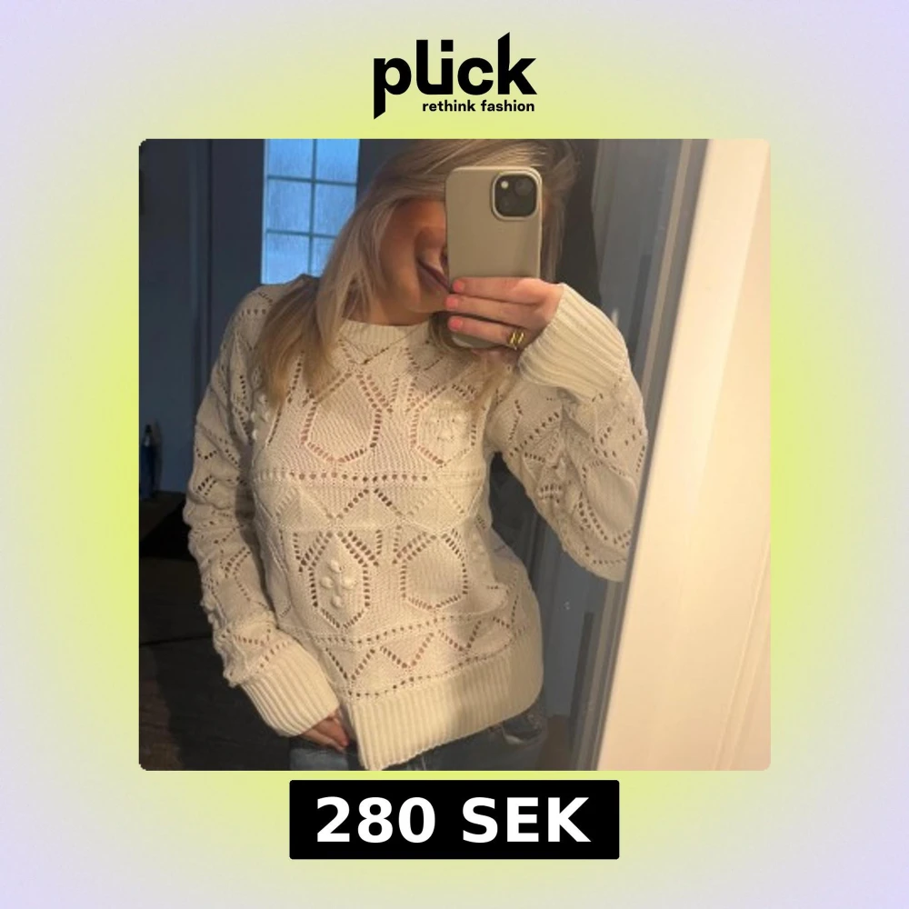 Säljer en vit stickad tröja med ett snyggt hålmönster. Tröjan har långa ärmar och ribbade muddar nere vid ärmen.