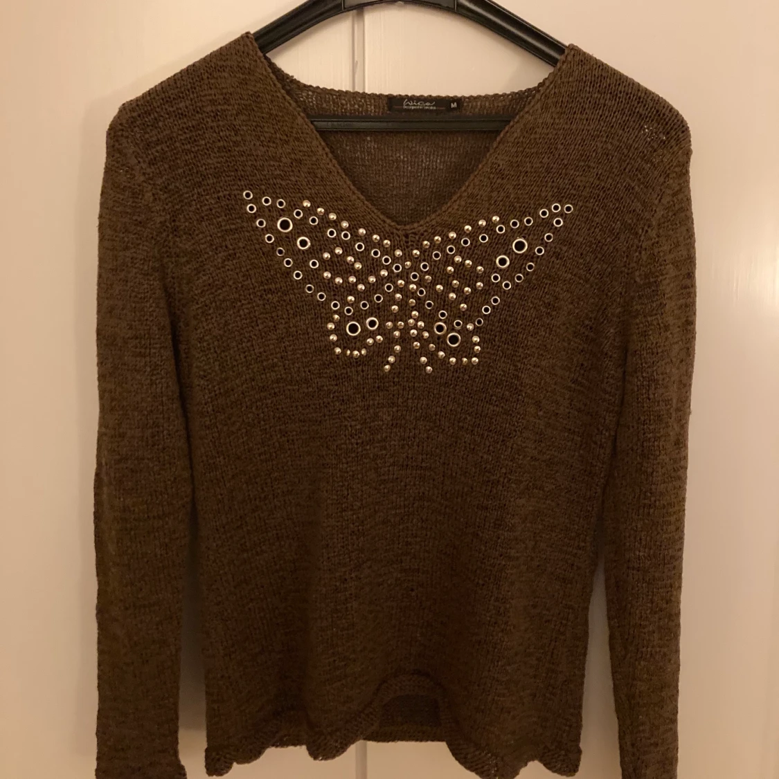 Jättefin brun tröja med en fjäril på bröstet. Nästan helt oanvänd. Möts i Stockholm, annars står köparen för frakt.