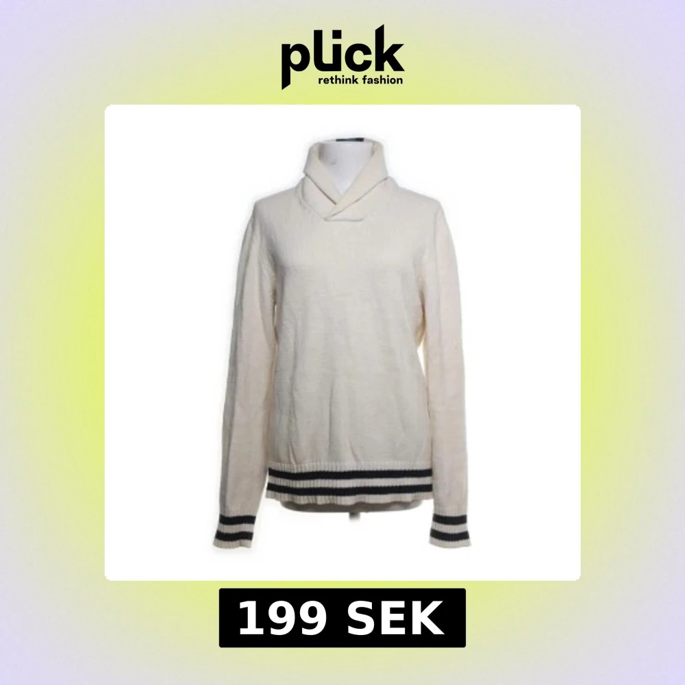 Säljer en stilren vit stickad tröja med långa ärmar och randiga detaljer i blått vid ärmslut och nederkant. Tröjan är unik men också just det som trendar just nu! Priset kan diskuteras vid snabb affär!