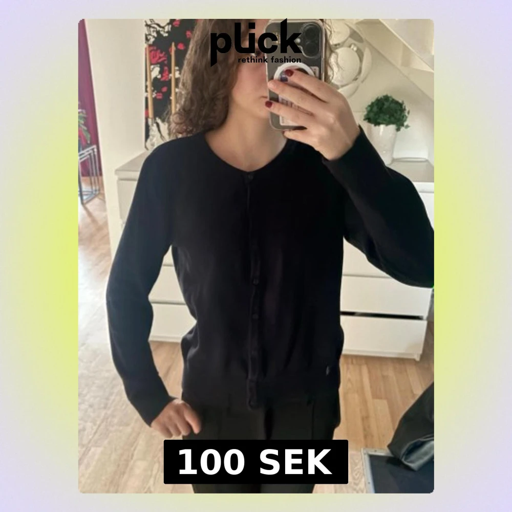 En klassisk svart kofta med rund hals och knäppning framtill. Koftan är i mjuk bomull och ifrån hm i storlek M men är som en S. Den är marinblå inte svart!
