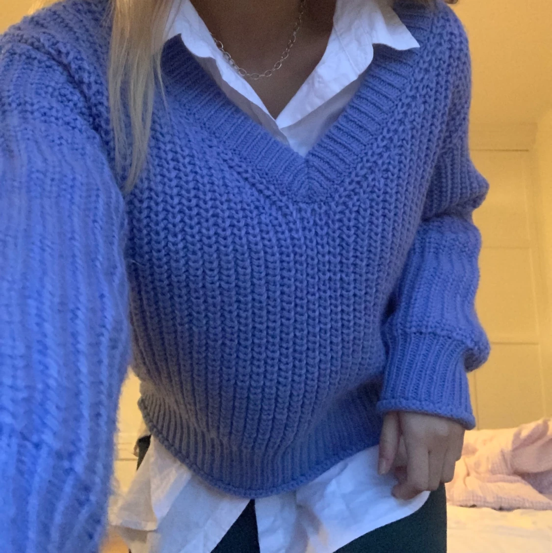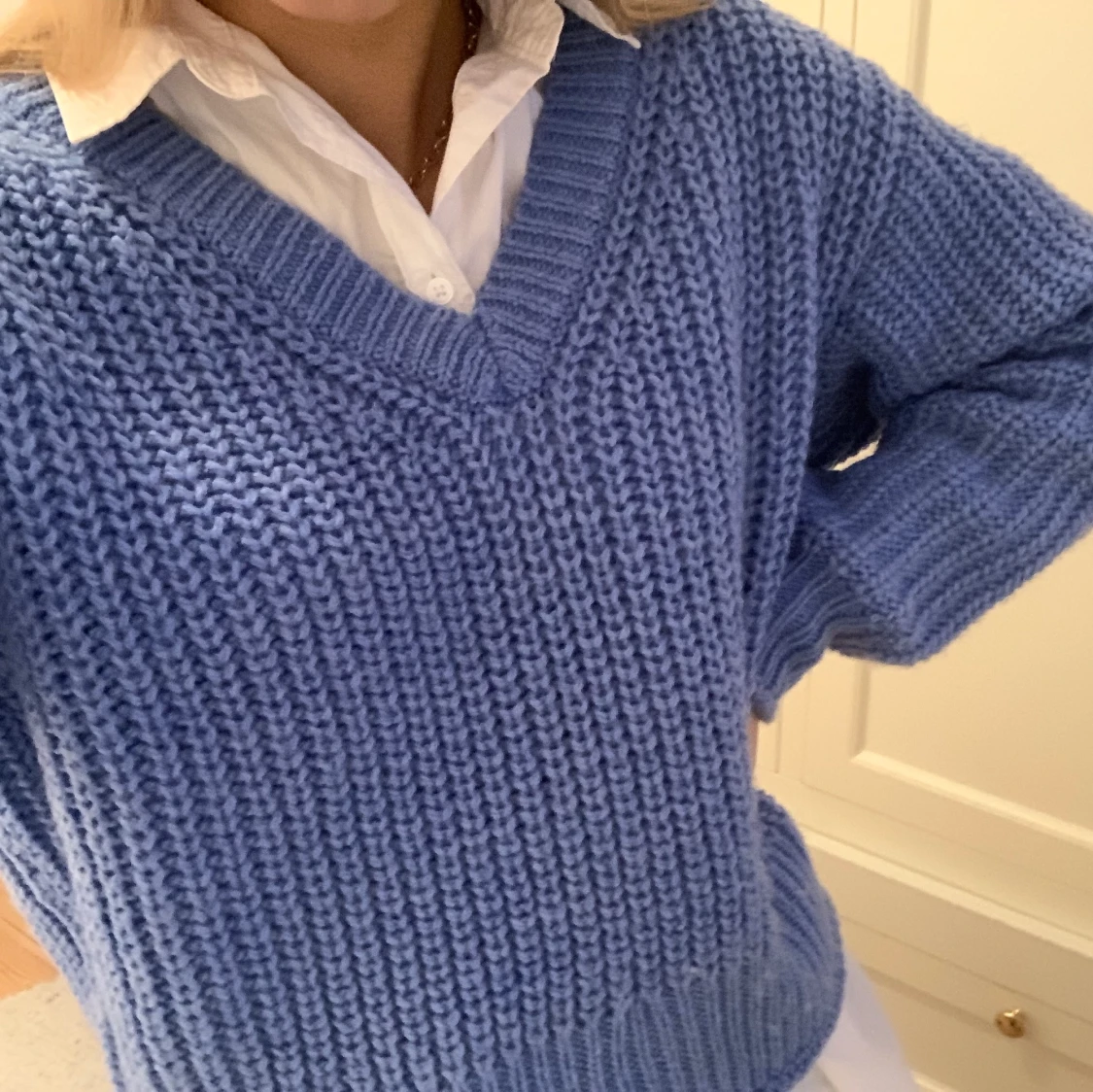 As snygg blå stickad tröja med v-ringning. Knappt använt så skicket är som nytt. Storlek XS men sitter som en S. Frakt tillkommer💓 buda på! Högsta bud 210+frakt